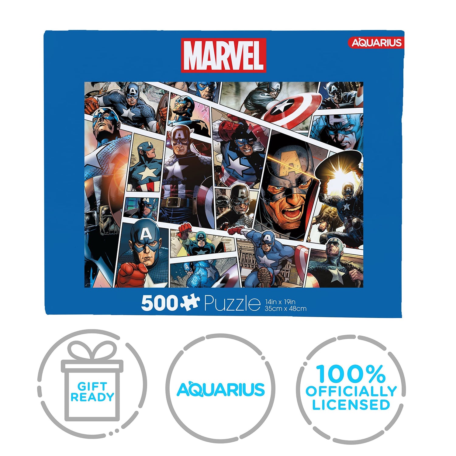 Details: 500 PIECE JIGSAW PUZZLE: Captain America fans will have a blast completing this 500 piece puzzle featuring imagery from the superhero himself. This unique puzzle measures 14 x 19 inches when fully assembled. LOOKING FOR MARVEL GIFTS? This Marvel puzzle is the ultimate superhero gift for Marvel fans of all ages. Perfect for family puzzling, game night, birthdays, and holidays. PREMIUM QUALITY YOU CAN TRUST: Our precision cutting technique ensures a perfect fit of all puzzle pieces, leaving virtually no puzzle dust behind. We use thick quality paper that is glare-free so you can show off your masterpiece with pride. 100% OFFICIALLY LICENSED MARVEL MERCHANDISE: This Marvel puzzle is designed by AQUARIUS, officially licensed, and 100% authentic. It's the perfect piece of Marvel collectible memorabilia to add to your collection. THE AQUARIUS PROMISE: It's simple. We stand behind our products 100% and if you're not completely satisfied with your purchase, we'll offer you a full refund! Click the yellow "Add to Cart" button today and buy with confidence. AQUARIUS games, puzzles, and playing cards are both a reflection of today’s favorites and a nod to the past and are designed to entertain young and old alike.