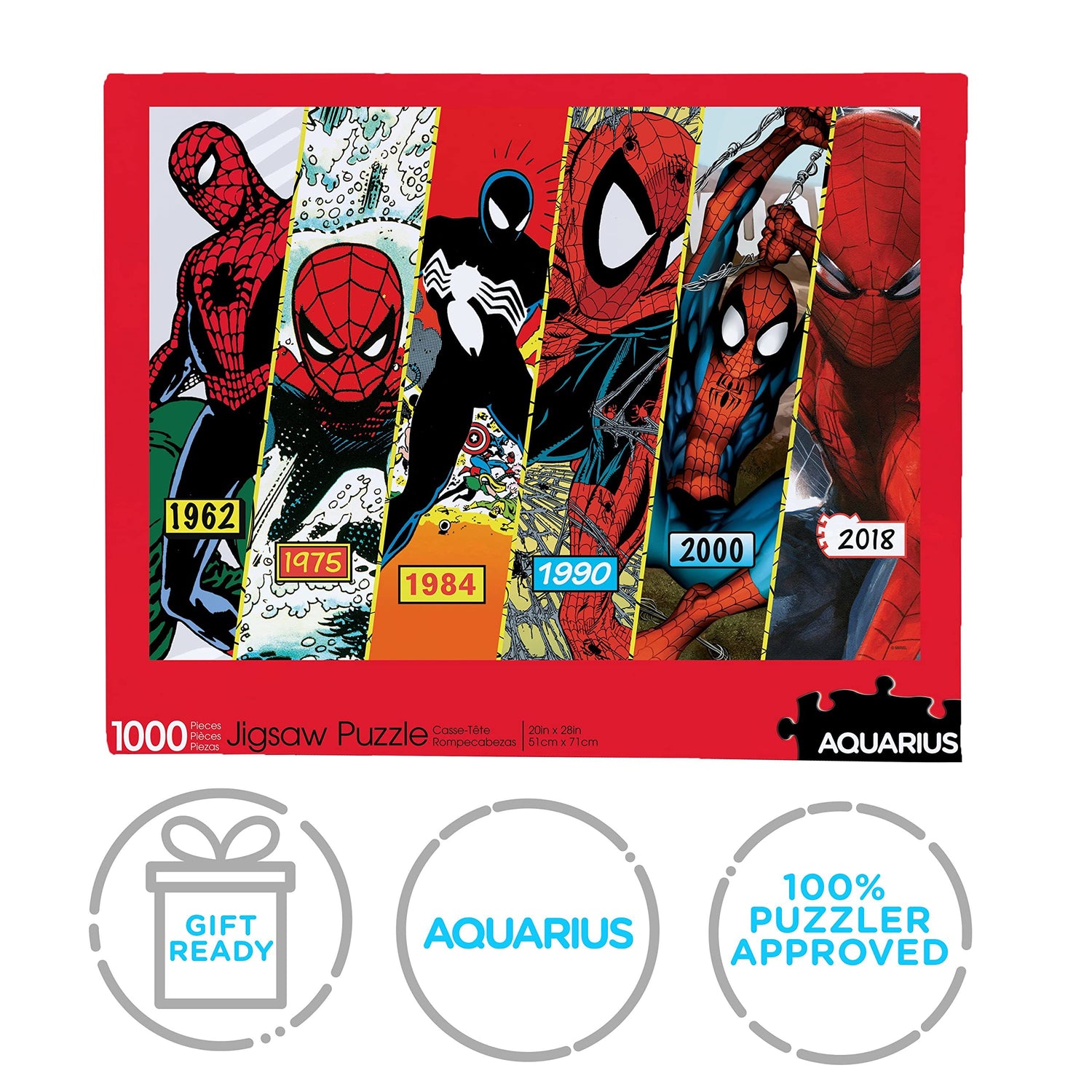 - 1000 PIECE JIGSAW PUZZLE: With great power, comes great puzzle making! Swing through decades of Marvel Comics history with the friendly neighborhood Spider-Man when you put together this 1000 piece puzzle. The completed puzzle measures 20x28 inches
