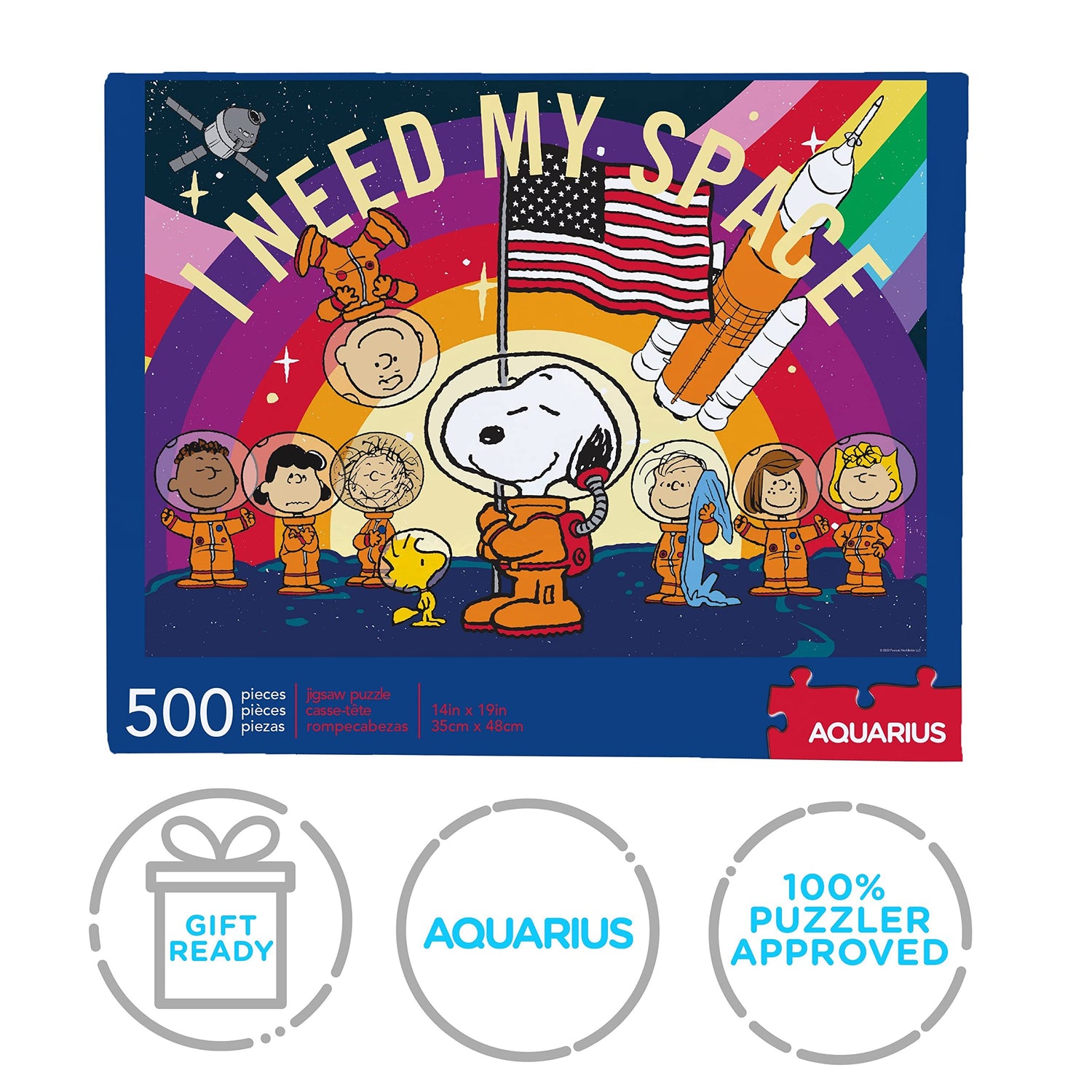 - 500 PIECE JIGSAW PUZZLE: Hop on a rocket and take a ride with Astronaut Snoopy and friends in this out of this world 500 piece puzzle. The Peanuts gang are going to the final frontier, space! The completed puzzle measures 14 x 19 inches