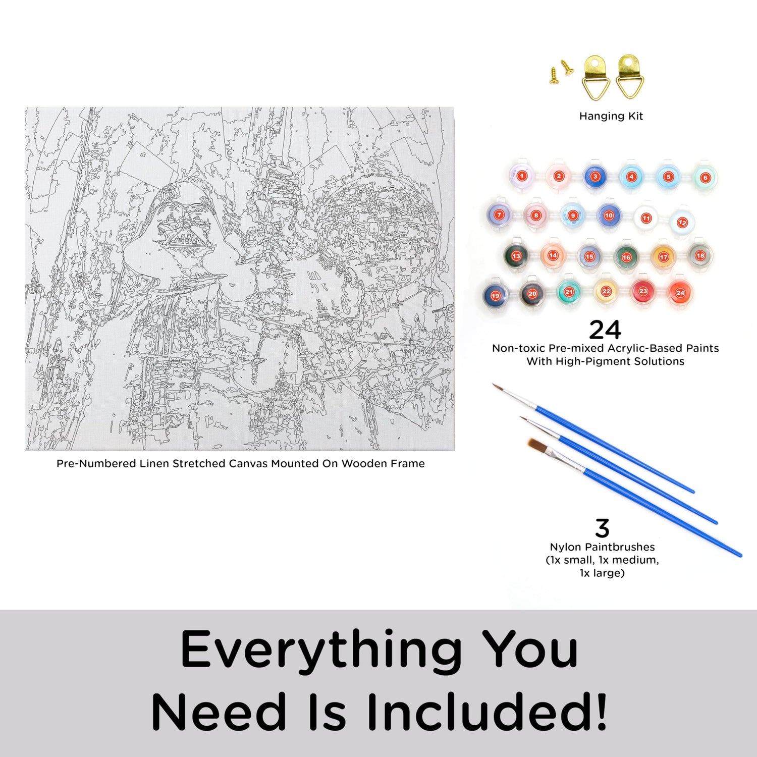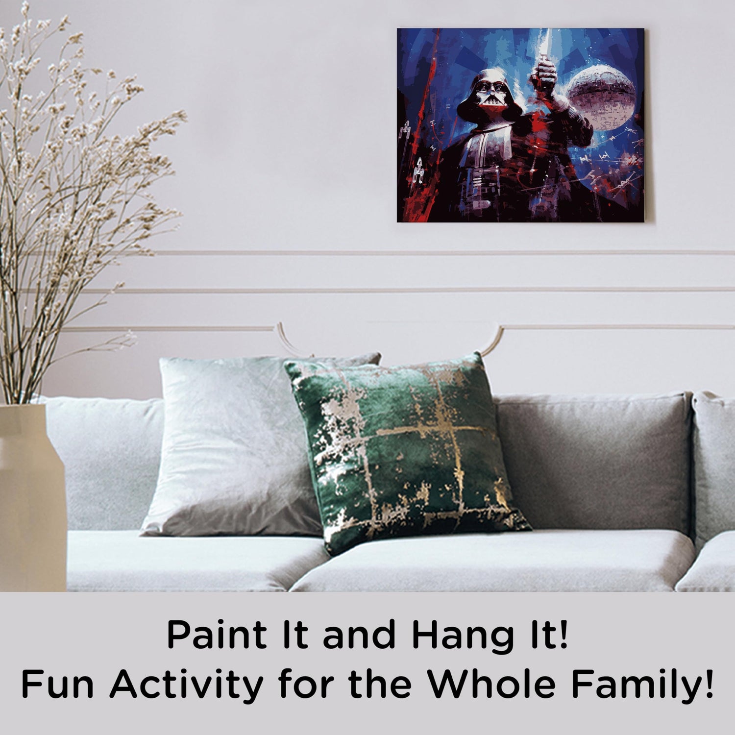 - 16 x 20 ART BY NUMBERS PAINTING KIT: Star Wars fans will have a blast painting this 16 x 20 masterpiece featuring the greatest villain of all time, Darth Vader. This unique art by numbers kit has a pre-stretched canvas that measures 16 x 20 inches, comes with 24 paints, 3 paint brushes and is ready to hang. The box has a handle for easy transport to wherever the inspiration takes you.