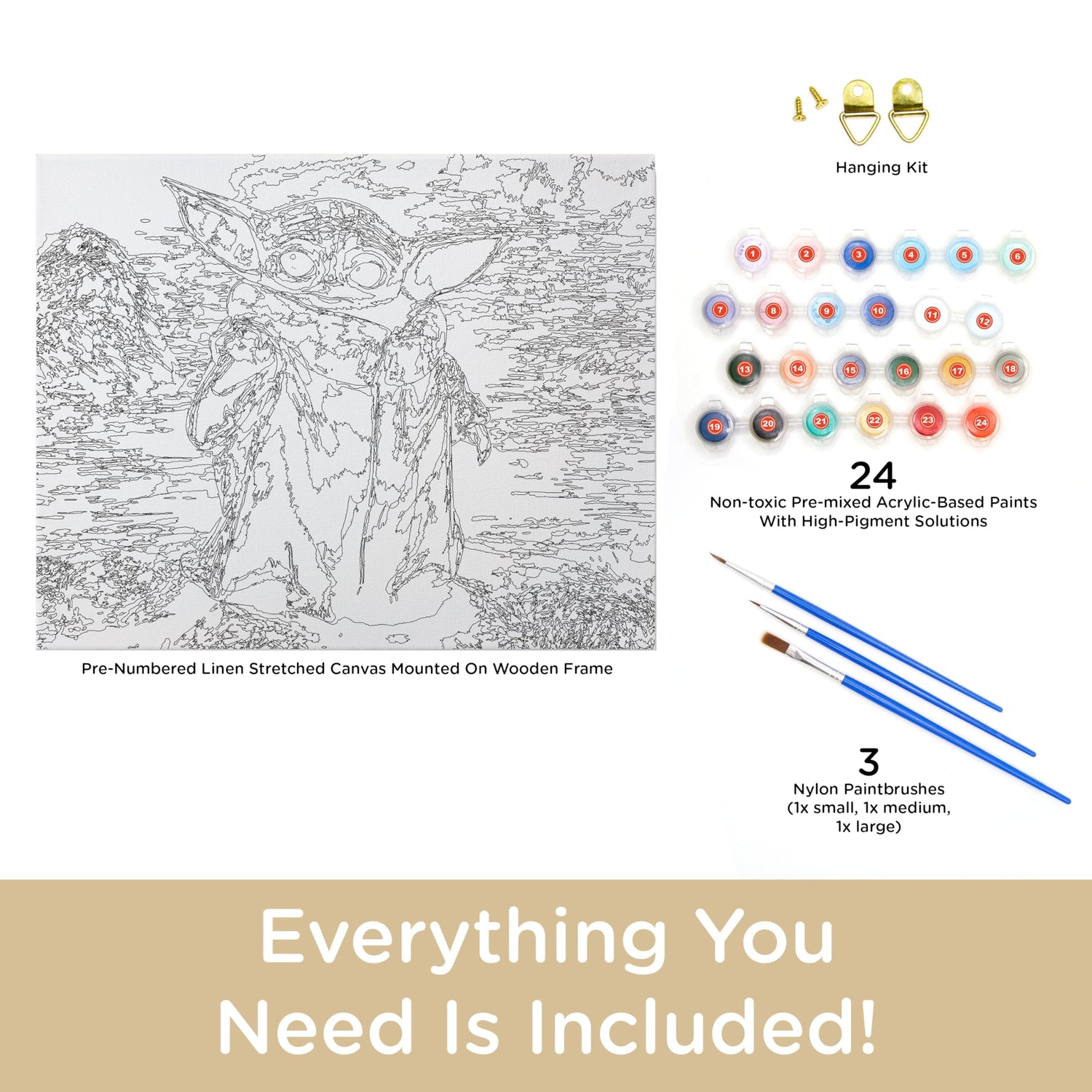 AQUARIUS Star Wars Mandalorian Grogu Art by Numbers Painting Kit (Stretched Canvas) 24 Paints, 3 Paint Brushes, Ready to Hang, Officially Licensed Star Wars Mandaalorian Collectible - 16"x20", Brown