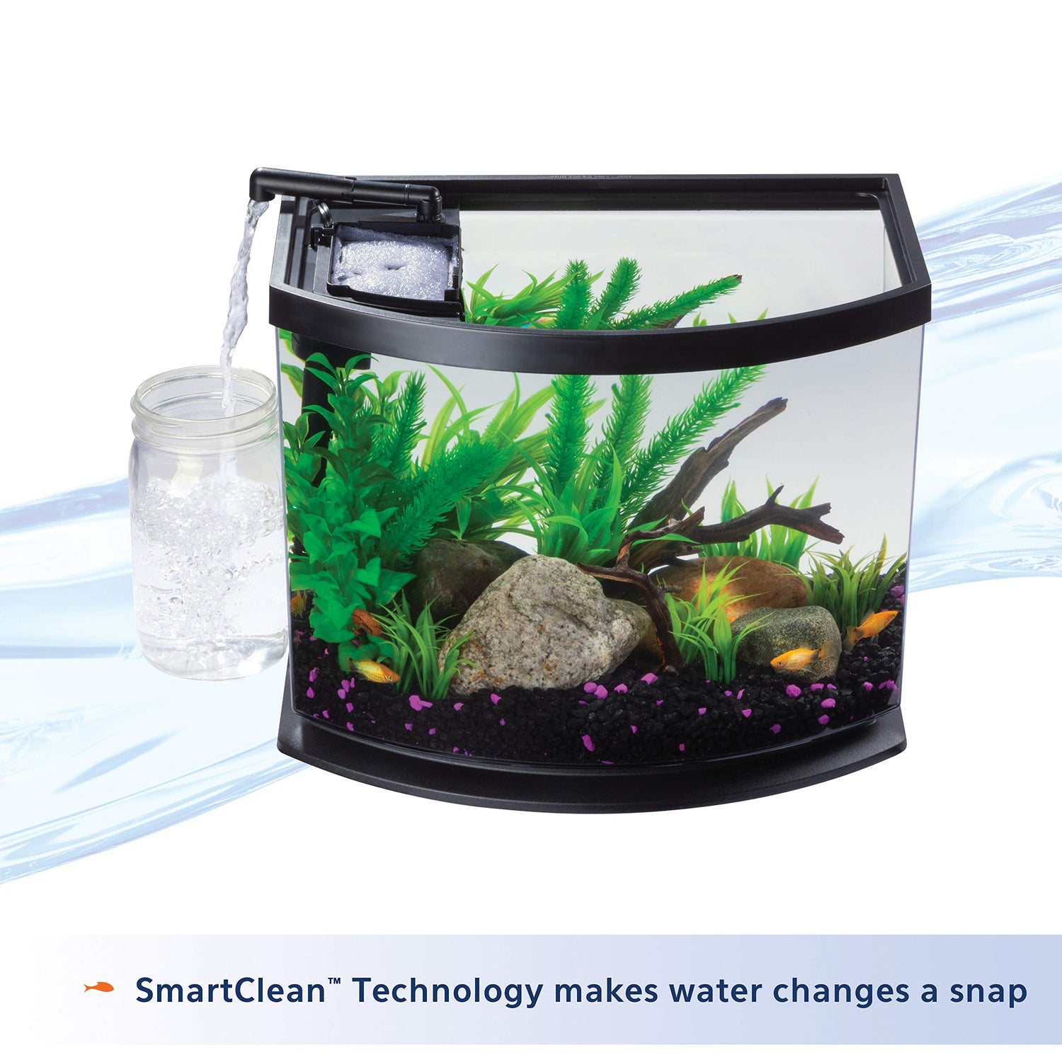 Details: Aqueon LED MiniBows Kits with SmartClean Technology are great for first time and experienced fish keepers. These desktop aquariums are great for bedrooms, living rooms, home offices and more. Each kit includes a clear acrylic vessel, low-profile LED hood, elevated base, filter cartridge, water care and food samples, and an illustrated setup guide to get you started. Also included is a uniquely designed power filter with SmartClean Technology that makes essential water changes quick, fast and easy to do in less than 2 minutes! In just three easy steps and a couple minutes each week helps maintain a cleaner and healthy aquatic environment with Aqueon LED MiniBow Kits with SmartClean Technology. This aquarium kit is the perfect home for Betta or small tropical fish. The filter uses Aqueon Small Replacement Cartridges. Replace cartridges every 4 weeks for optimal performance. Available in different color and size tanks.