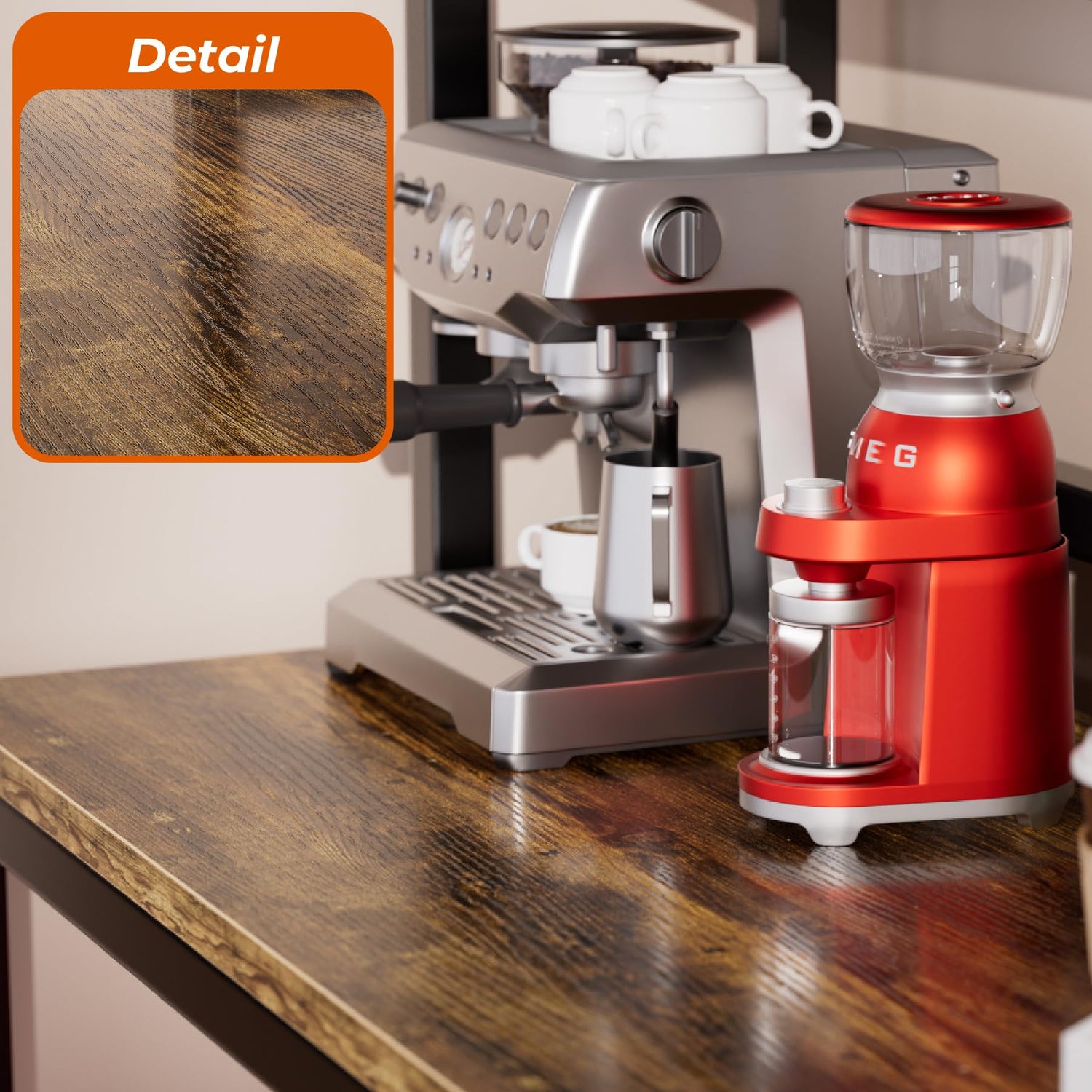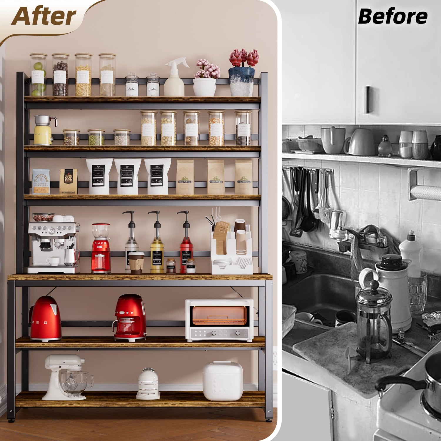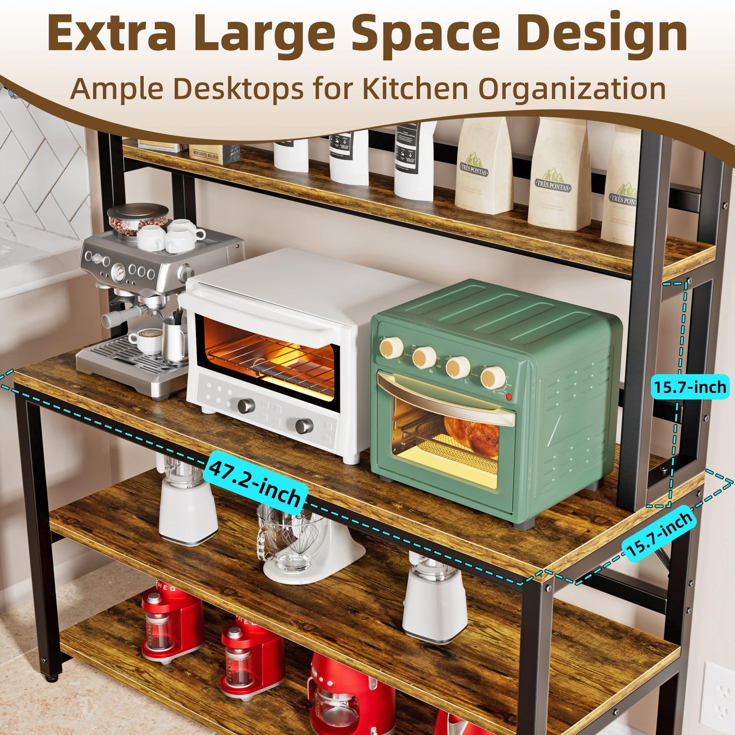 - 【Extra Large Capacity】-This high capacity rustic brown bakers rack with storage surface is (47.2in*15.7in) offers you super large organizing & working space, perfect fit for microwave, toaster, coffee machine, oven, blender, air fryer, and other small kitchen appliances. The 3-tier upper storage shelves and under rack provide plenty of space for storing mason jars, food containers, spice jars, seasoning bottles, bins, cups and other kitchen and household items. Keep your kitchen clean and tidy.