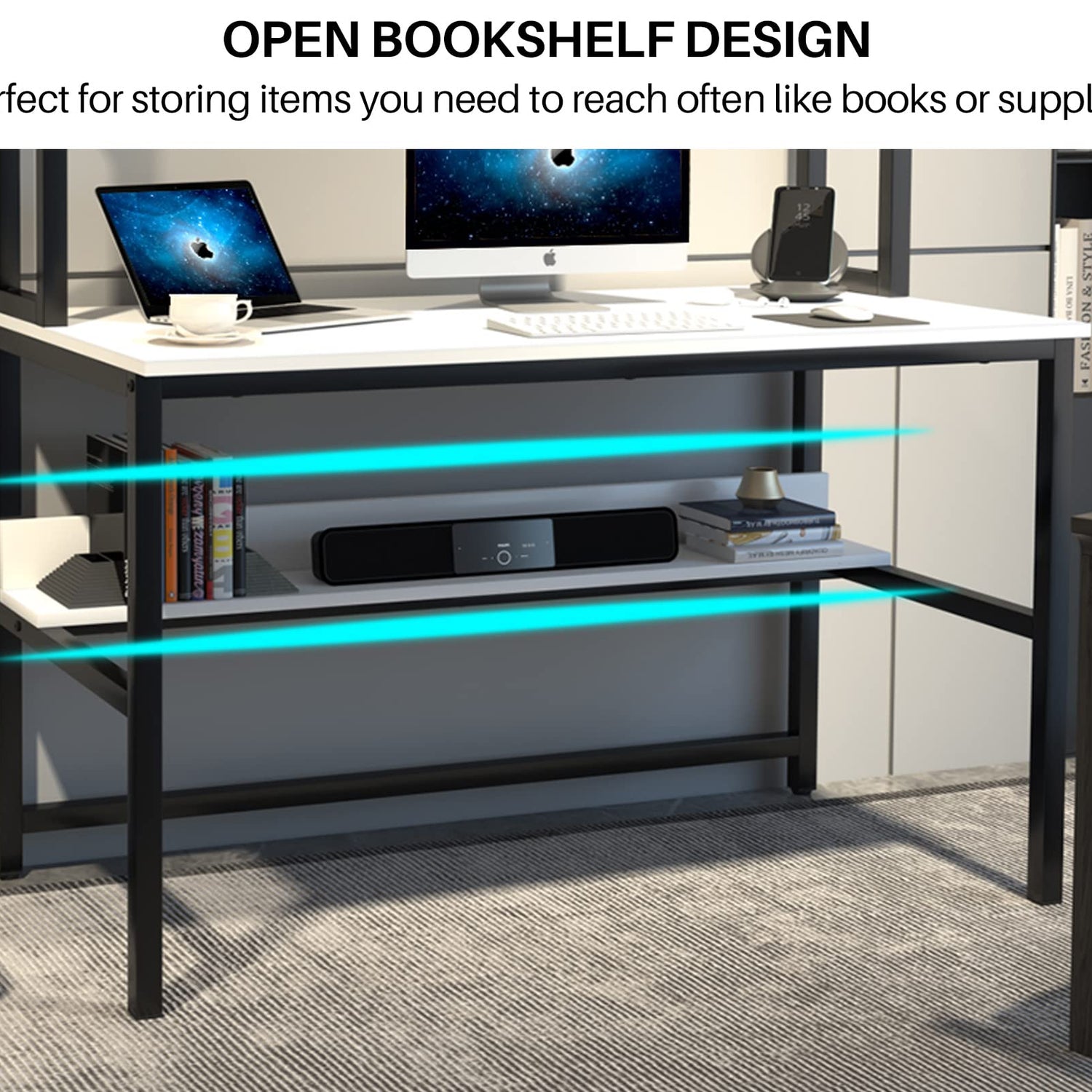 Aquzee White Computer Desk with Hutch and Shelves - Easy Assembly Gaming Table with 4 Tiers for Storage and Study