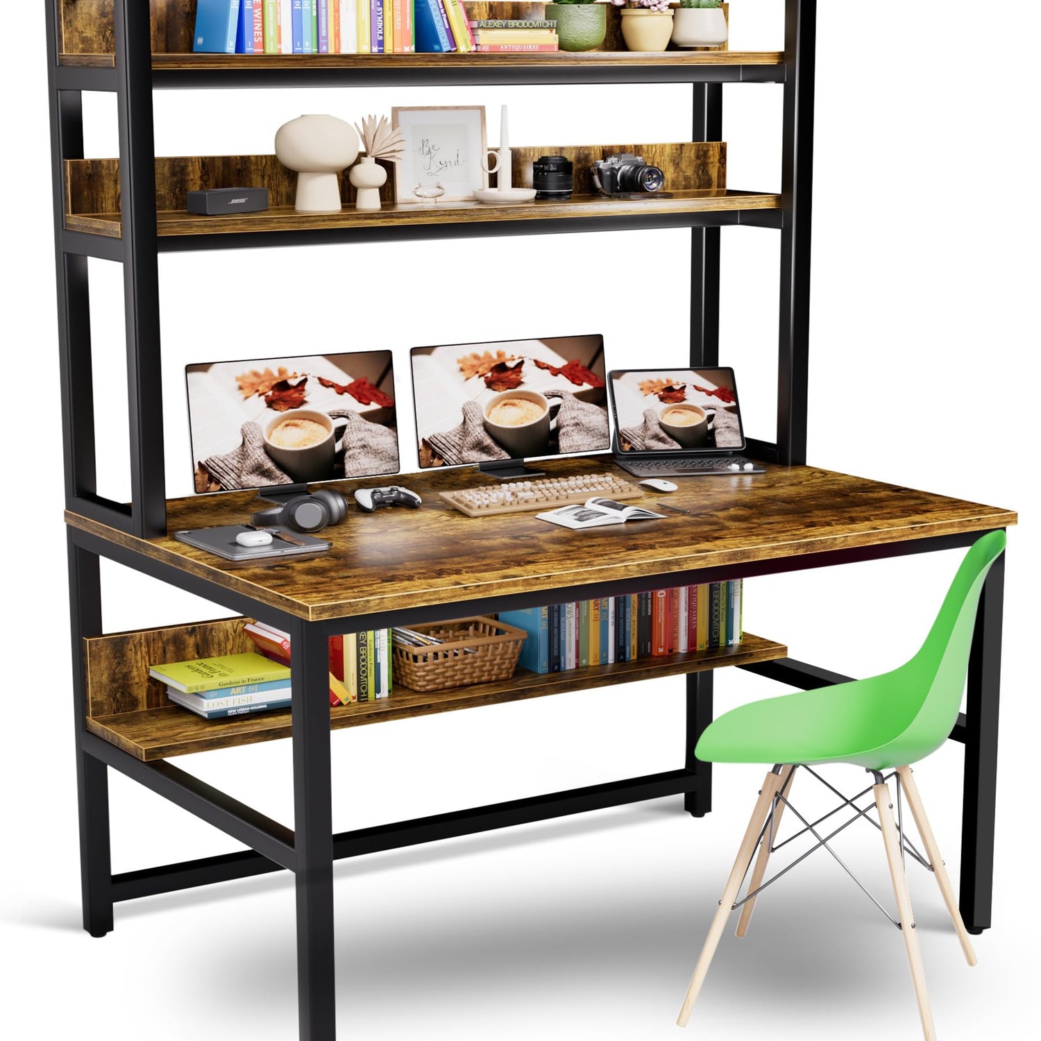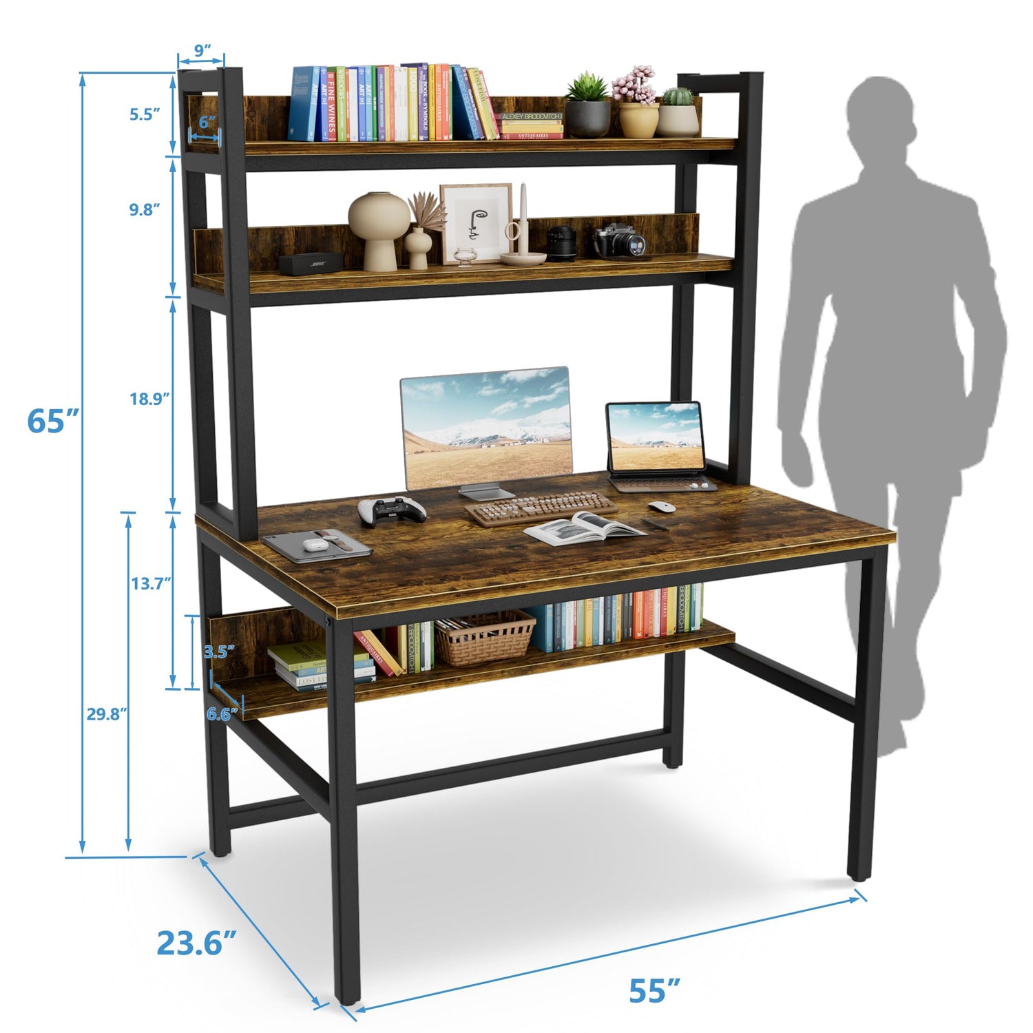 Aquzee 55 Inch Rustic Brown Computer Desk with Hutch and Storage Shelves
