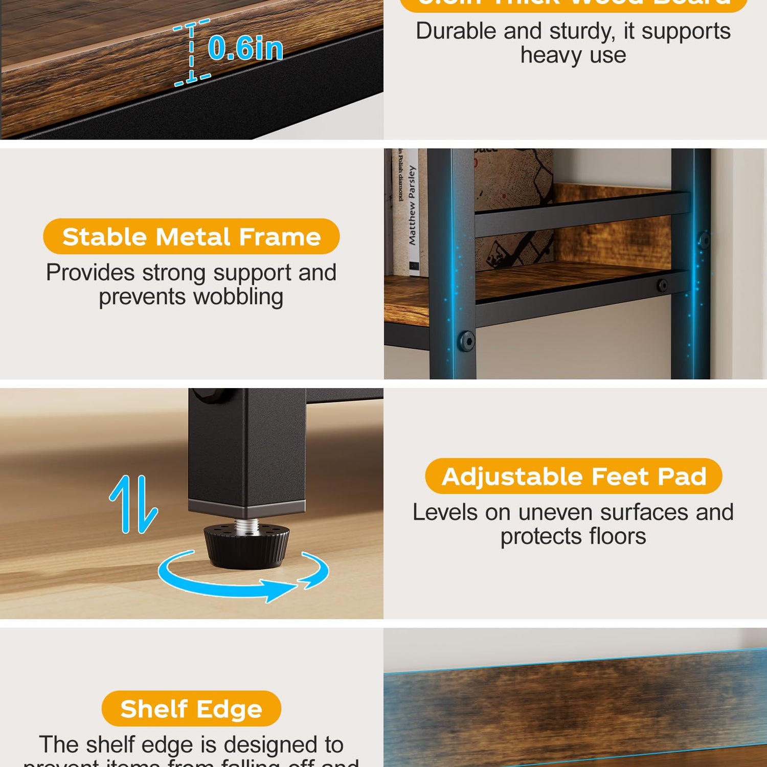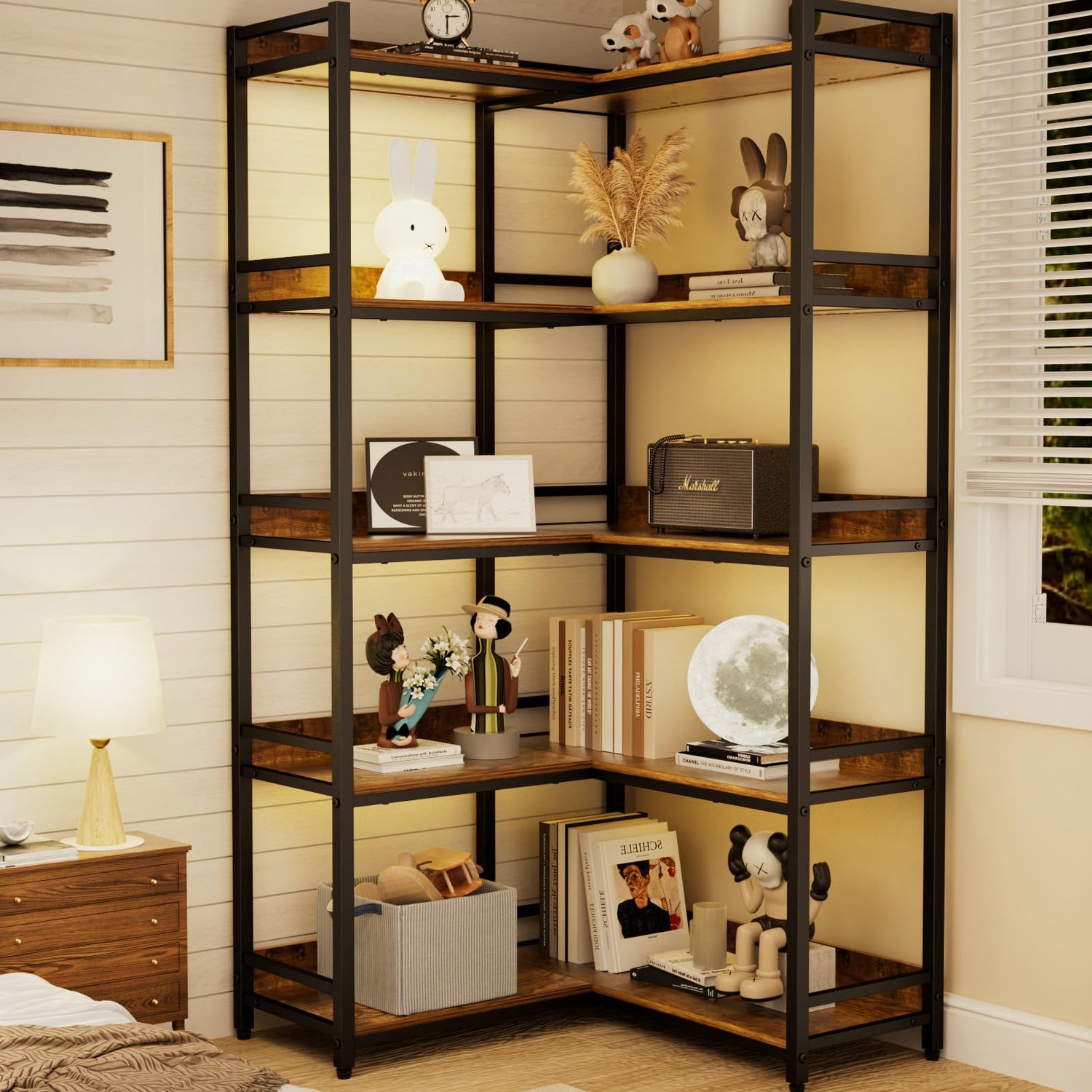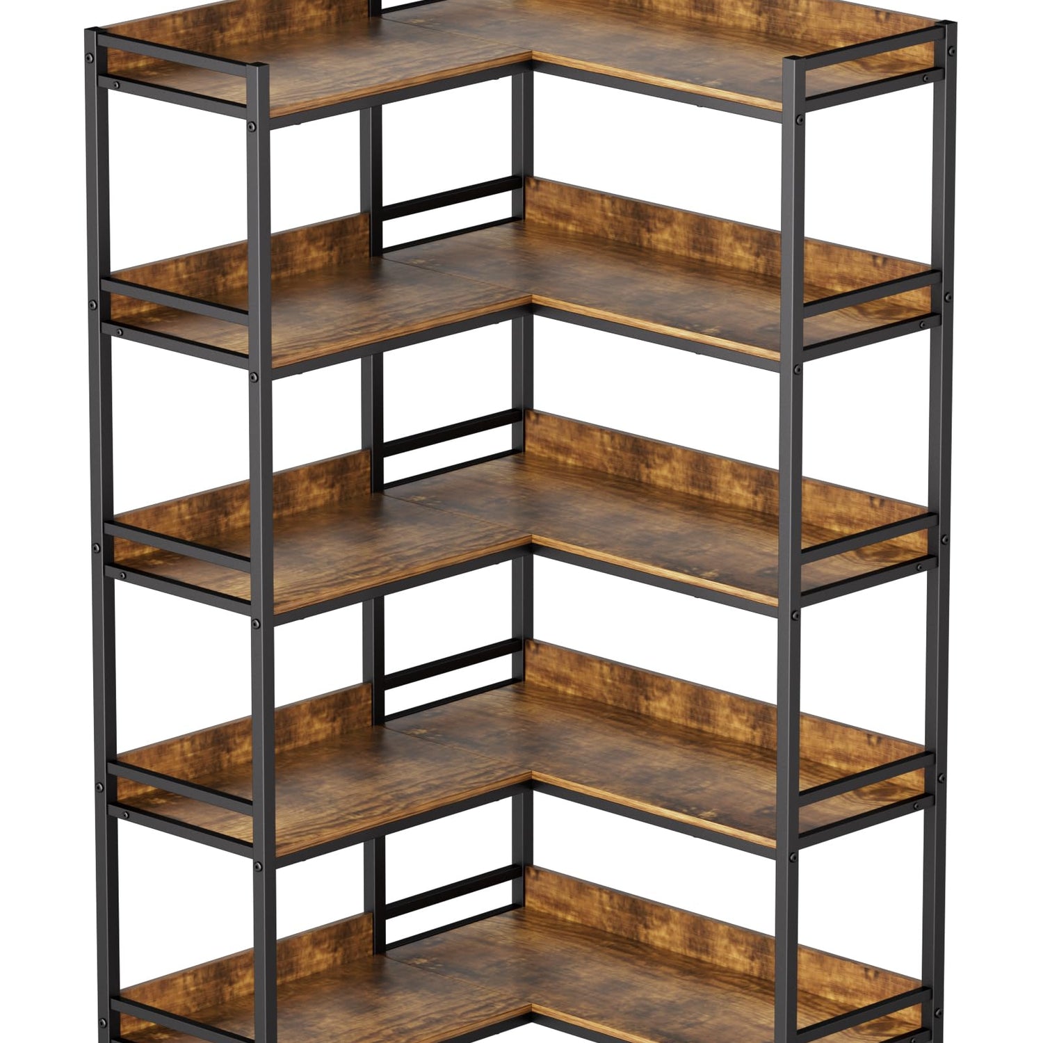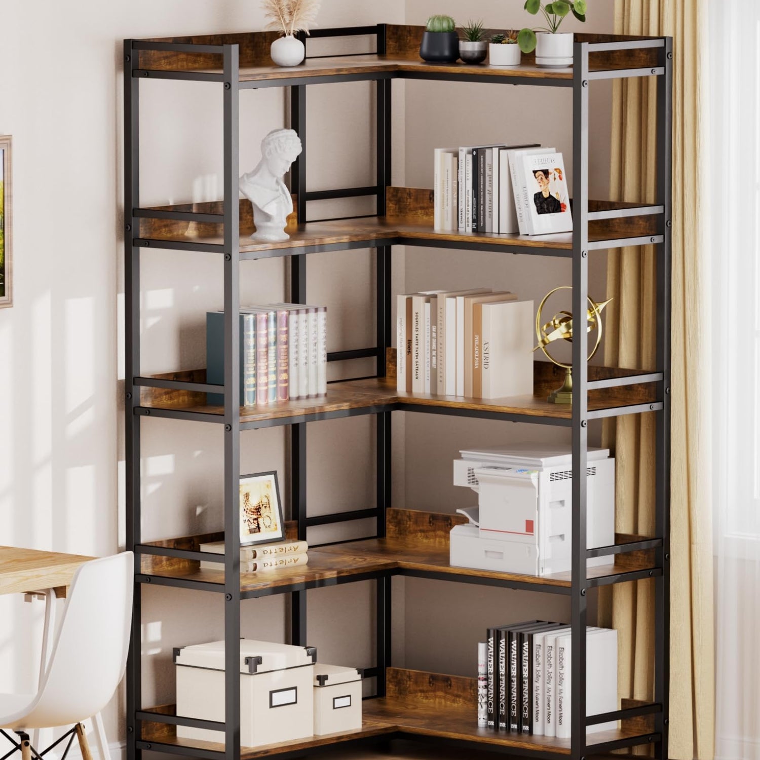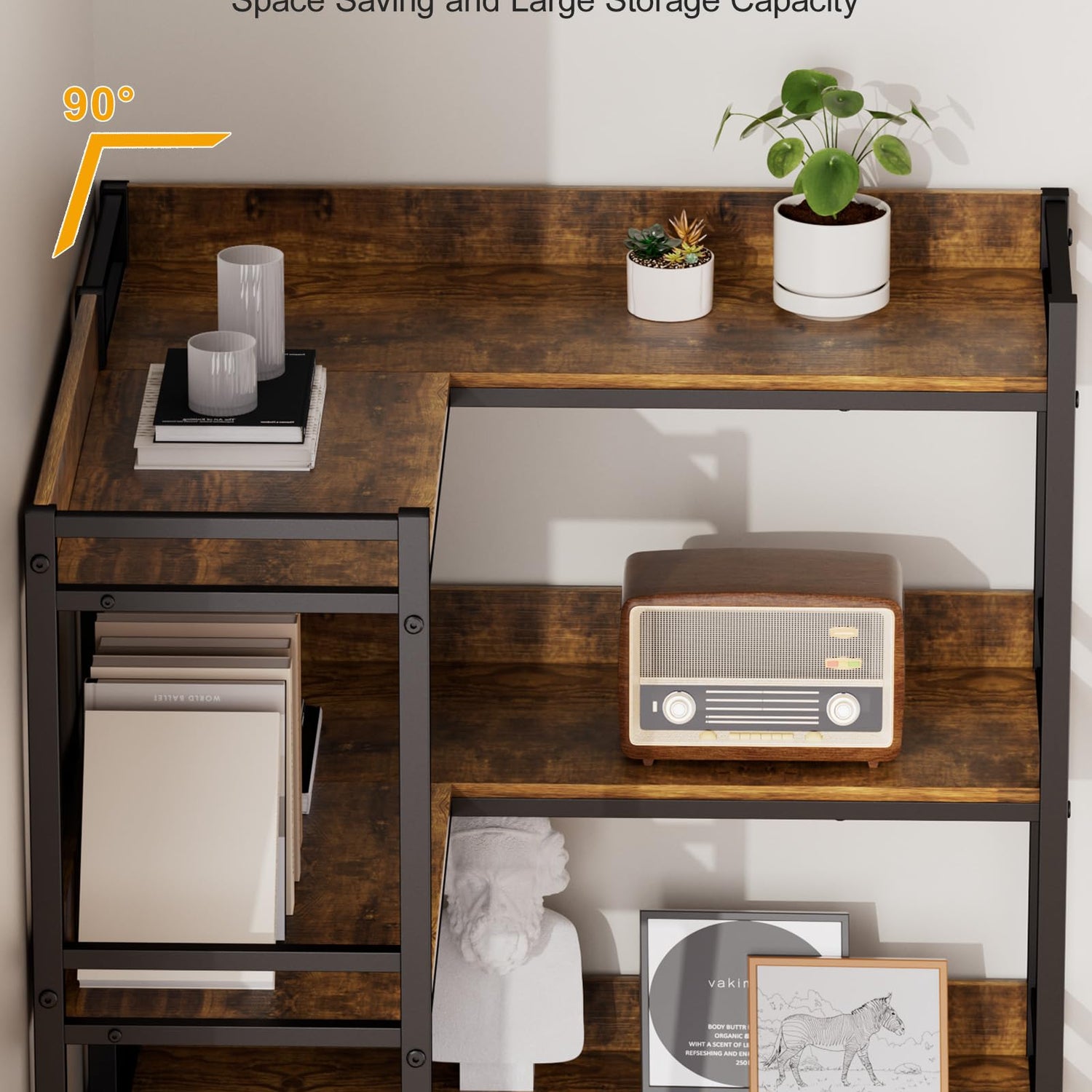 - ✔【ADD VISUAL CHARISMA】 Steeped in rustic style, this corner shelf with matte black frame, back fence blends functionality and self-expression together, working as a real enrichment for the lovers of industrial design furniture. This 5-shelf bookshelf is a great solution to add extra space for living room, bedroom and small apartment.
