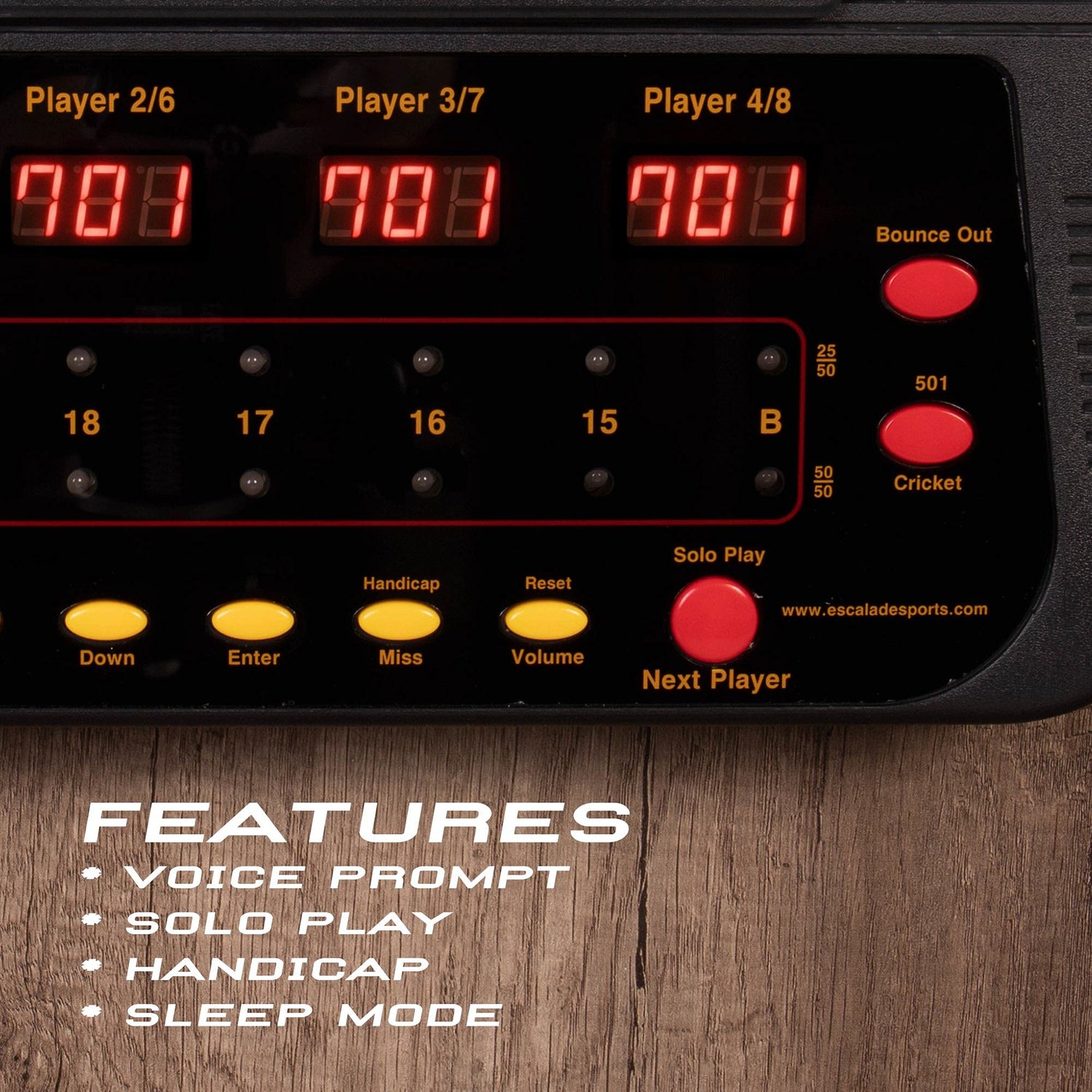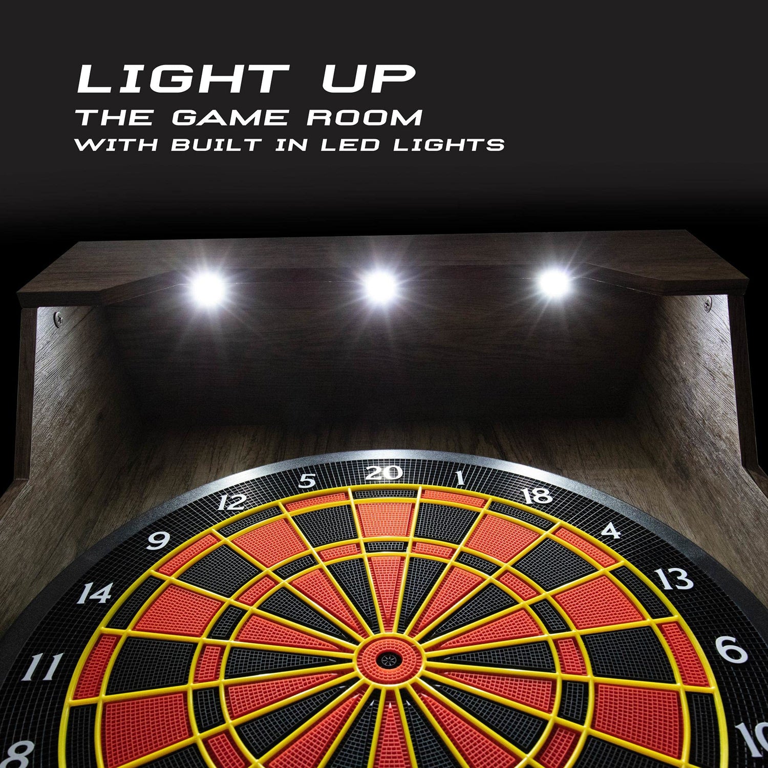 Details: Turn your rec room into an arcade with the Arachnid E650 Free Standing Dartboard Cabinet Set. The standing rustic tan wood grain finish cabinet with LED lighting brings the arcade to you. This black freestanding cabinet houses the feature-packed CricketPro 650 Electronic Dart Game, which includes a regulation 15.5" target area and 24 games with 132 options, including 5 cricket games. The LED display keeps score for up to eight players at one time, so you can have plenty of friends over for arcade-style fun. The cabinet has convenient storage with three shelves plus additional storage space under the lid for all of your darting accessories. Assembly required. Dartboard accessories included. The ARACHNID trademark is a registered trademark owned by ARACHNID 360 LLC and used by Escalade Sports pursuant to license. For customer support, please contact ESCALADE SPORTS at 1-800-467-1421 or gameroom@escaladesports.com