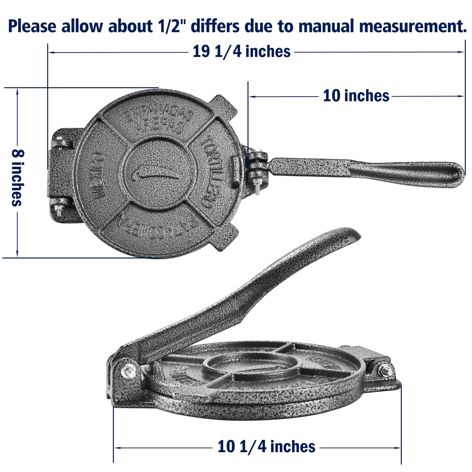 - 【4 Sizes Selection】This taco maker is available in four sizes, 6.5"- 4.69 lbs, 7"- 4.93 lbs, 8"- 8.45 lbs, 10"- 18.25 lbs. Tips: Corn tortillas do better with a smaller diameter press, while flour tortillas require larger pressing areas.