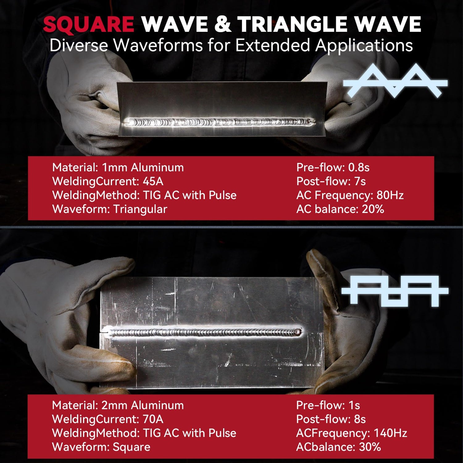 - PULSE & SQUARE & TRIANGULAR WAVEFORM: The ac/dc TIG welder is equipped to prevent the burning of materials and minimize material distortion from excessive heat input, as well as the triangular wave reduces the heat input effectively, so the weld forms rapidly. It is easy for thin metal welding; Square Wave can switch the polarity quickly, dynamic arc for a stable weld pool, a strong ability to clean aluminum oxide film, so it provides more precise welding on aluminum or aluminum alloy.
