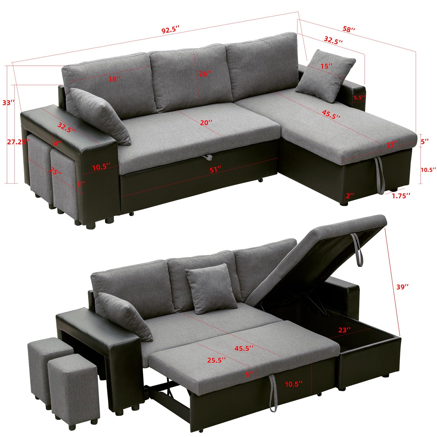 92.5" L-Shape 3 Seat Reversible Sectional Sofa Couch with Pull Out Bed, Sleeper Sofa with Storage Chaise and 2 Stools