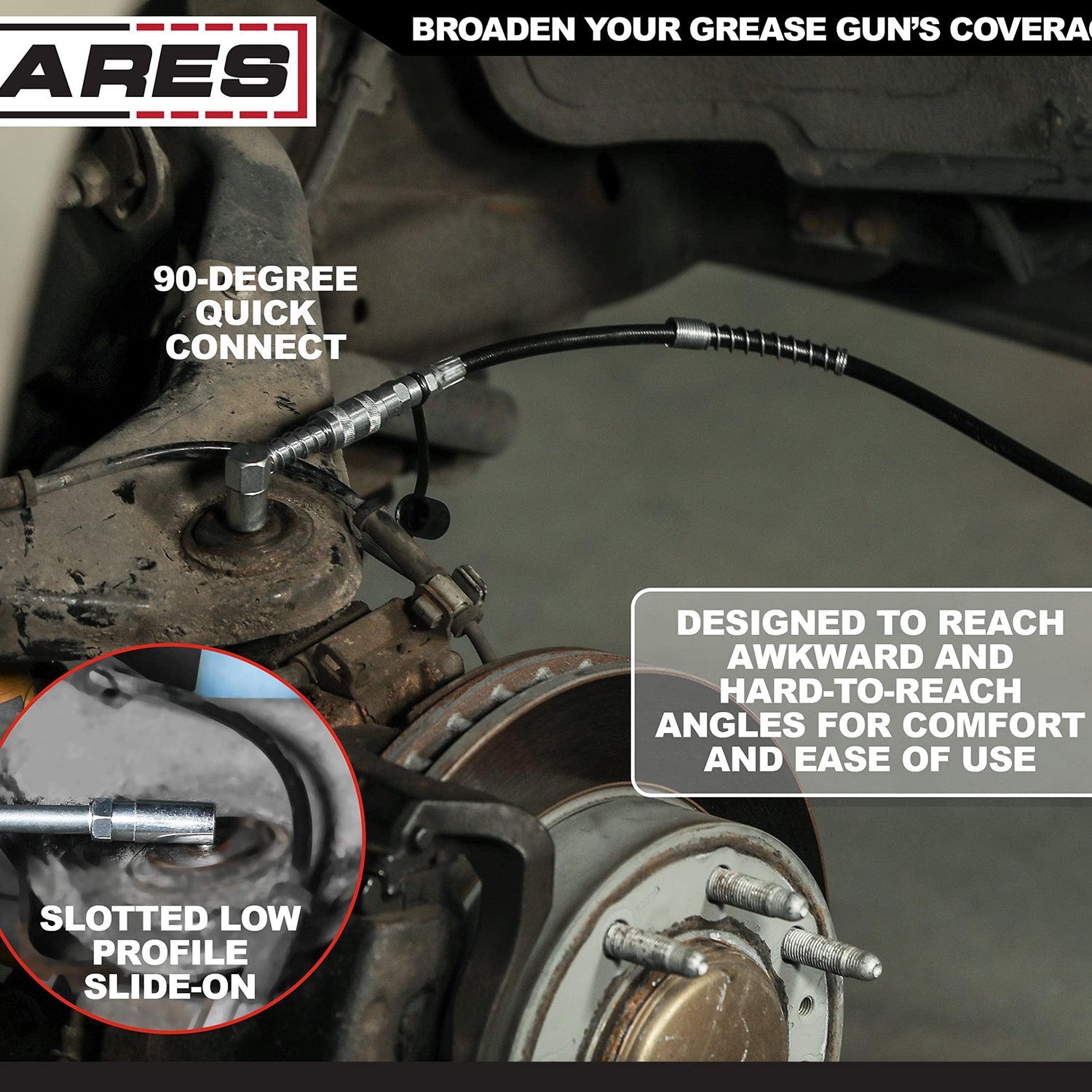 - VERSATILITY: With both the quick connect and slide-on adapters on hand, you’ll have the tools you need to make the hardest-to-reach lubrication job a simple task. Use the spring-loaded coupler or the low-profile push-on adapter to handle pesky, hard to reach lubrication points like upper ball joints and steering linkage Zerks fittings and leave awkward shifting and shuffling for access in the past.