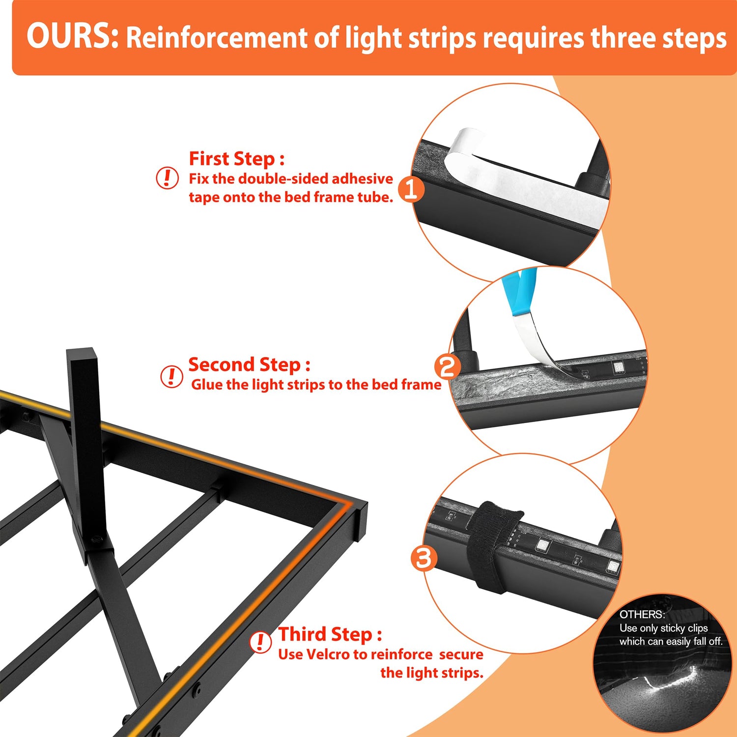 - Under-bed SELF-ADHESIVE LED LIGHTS: Queen Bed Size 80inch *60inch*35.4inch(L*W*H)The platform bed frame queen can enhance your bedroom ambiance with optional self-adhesive LED lights. The bed frame is equipped with one hidden light strip under the queen size bed frame. The LED light with a variety of colors and light patterns creat the perfect atmosphere for any occasion.