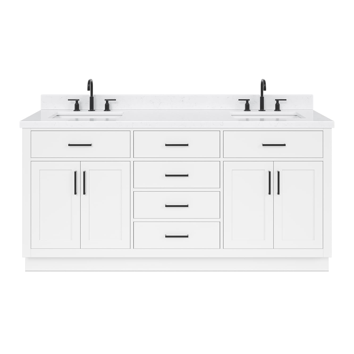 ARIEL Hepburn 72" White Double Vanity, 1.5" Edge Carrara Quartz Countertop & Splash, Rectangular Sinks, 4 Soft Closing Doors, 6 Full Extension Dovetail Drawers, Toe Kick, Matte Black