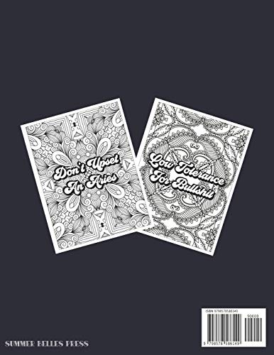 This Aries coloring book is focused on all things Aries and consists of 30 coloring pages that provide fun sayings (where you can determine if you agree or disagree) and ultimate relaxation with the mandala/floral backgrounds. The book starts with easy backgrounds and slowly progress into more difficult coloring pages.