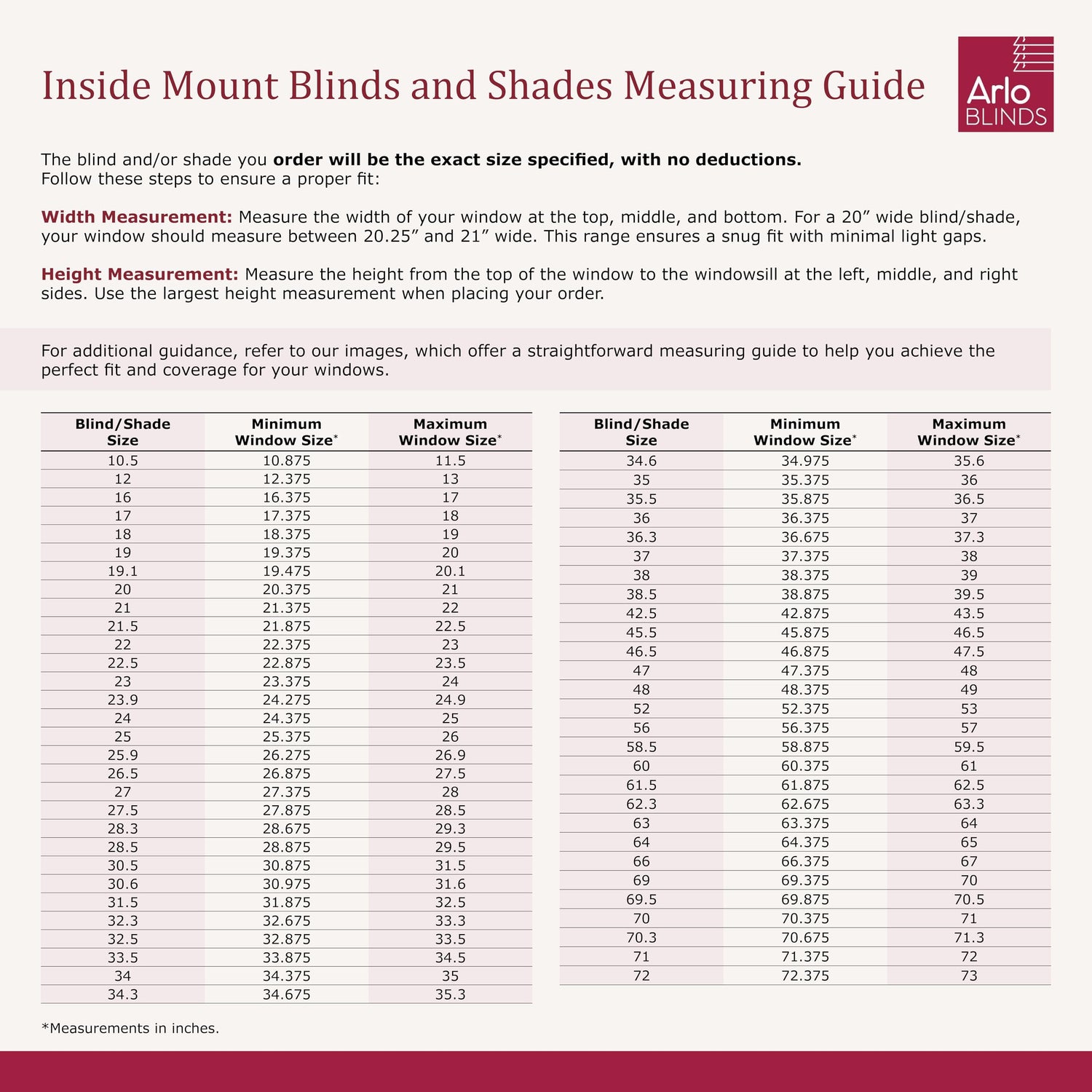 - Important measuring notes - The window blind listed measures 34 inches wide. If you choose to inside mount, and your window frame size is between 34.375 to 35 in. wide this faux wood blind is recommended. A wider window and there will be more of a light gap, a more narrow window and the faux blind will likely not fit; in these cases please look at our other size options. Please view more detailed measuring instructions for inside or outside mounting within the product images section.