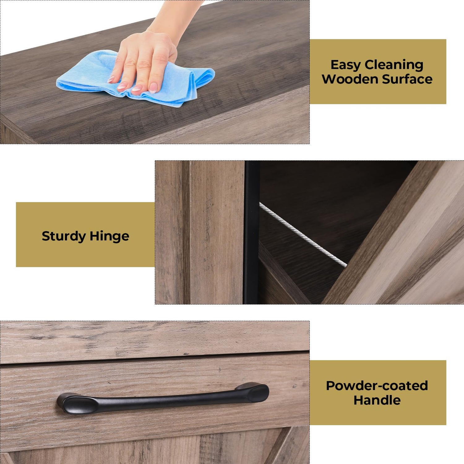 Arlopu Double Tilt Out Trash Cabinet, 20 Gallon Pet Proof Kitchen Pull Out Recycle Cabinet, Freestanding Wooden Laundry Sorter Cabinet, W/Drawer, Barn Door, for Home, Living Room, (Greige)