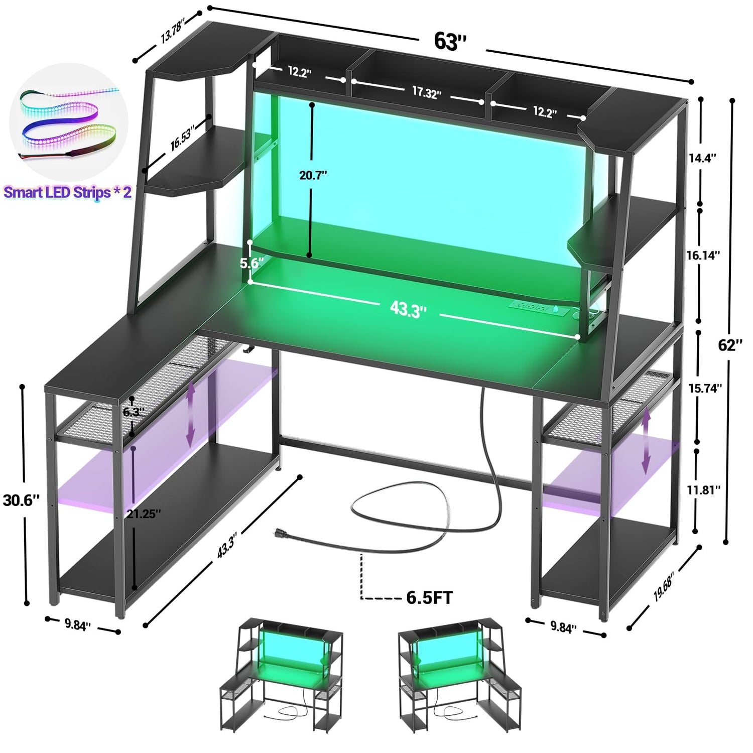 armocity 63'' L Shaped Gaming Desk with LED Lights & Power Strips, Reversible Gaming Table Desk with Hutch, L-Shaped PC Gaming Desk with Storage Shelves, L Desk for Gaming with Monitor Stand, Black