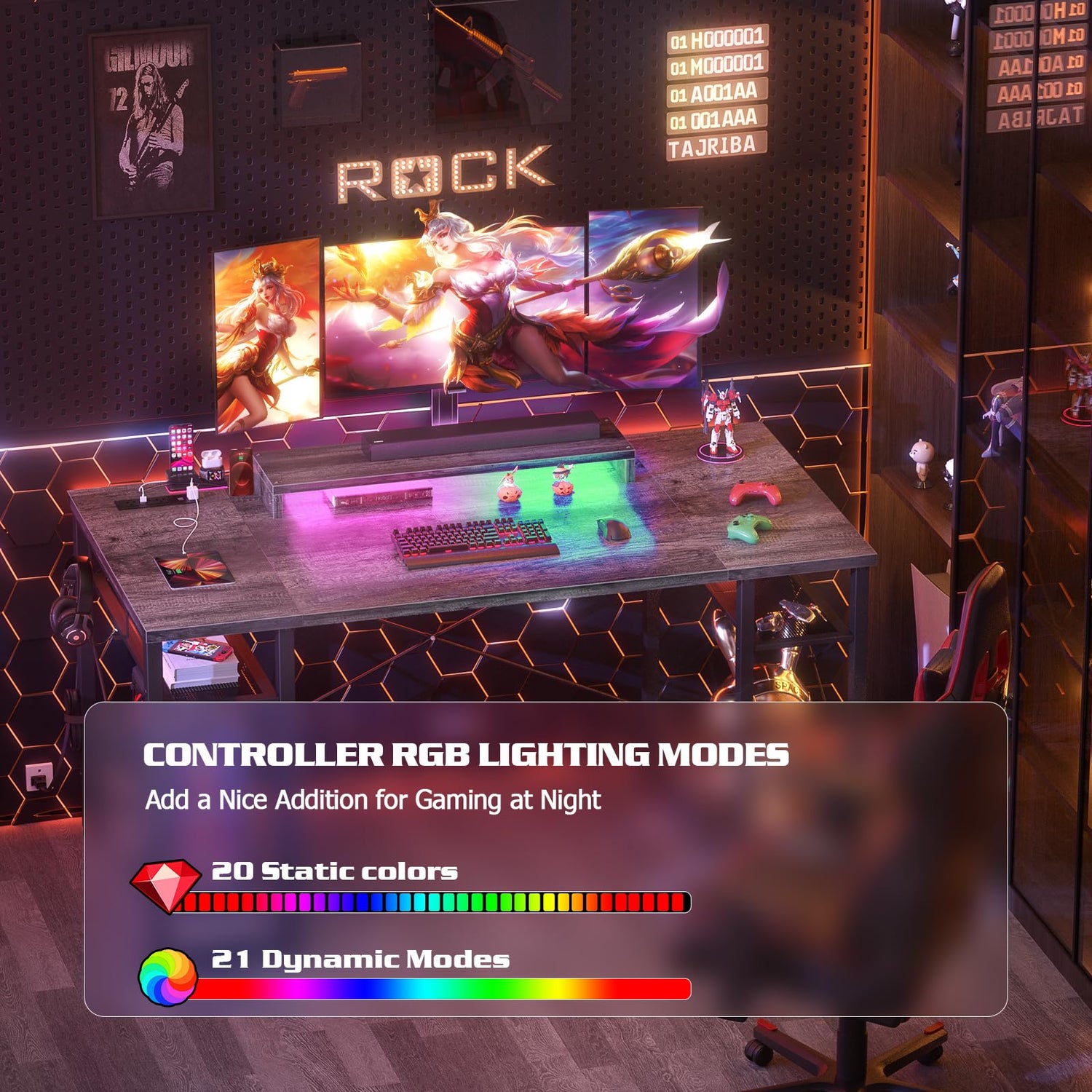- Magic Computer Desk with LED Lights - Do you need to add some atmosphere in your room space when you use your desk? Armocity 55 Inches gamer desk with LED will bring magic LED light for you. You just need to use an app or RF remote to control the light brightness and speed. Besides, if you use app control, it is also music sync, it can flow with your mobile music. That will look so cool and wonderful. Just plug the wire of the LED light into the USB, which will surely delight your room space.