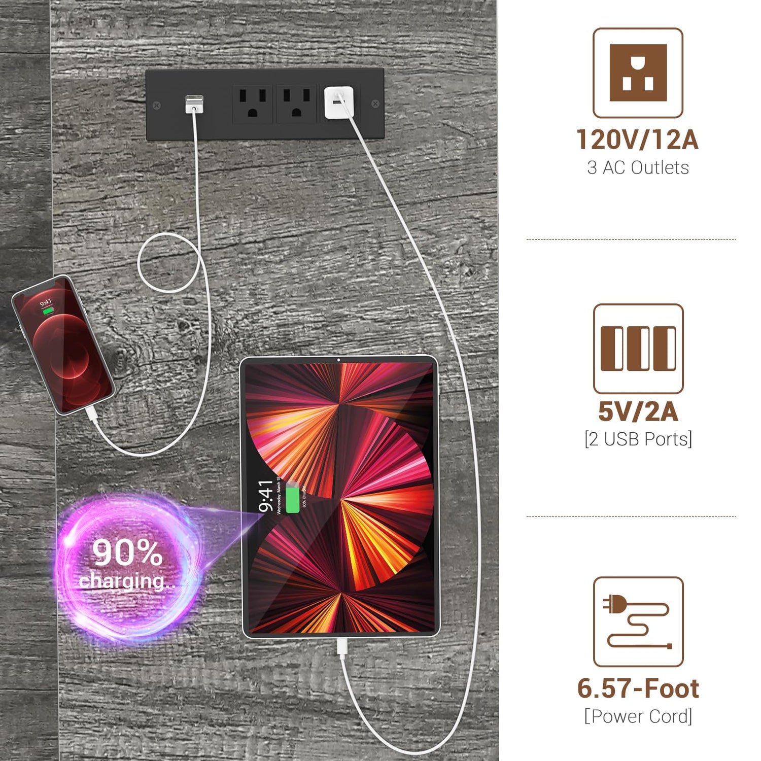 - Desk with USB Charging Station & Power Outlets - Armocity computer desk comes with 3 outlets and 2 USB ports for your table lamp, pad, phone, audio equipment, pc monitor, and gaming gear with fast charging, you don't need to add an additional charger. The length of the cable is 6.57FT long.