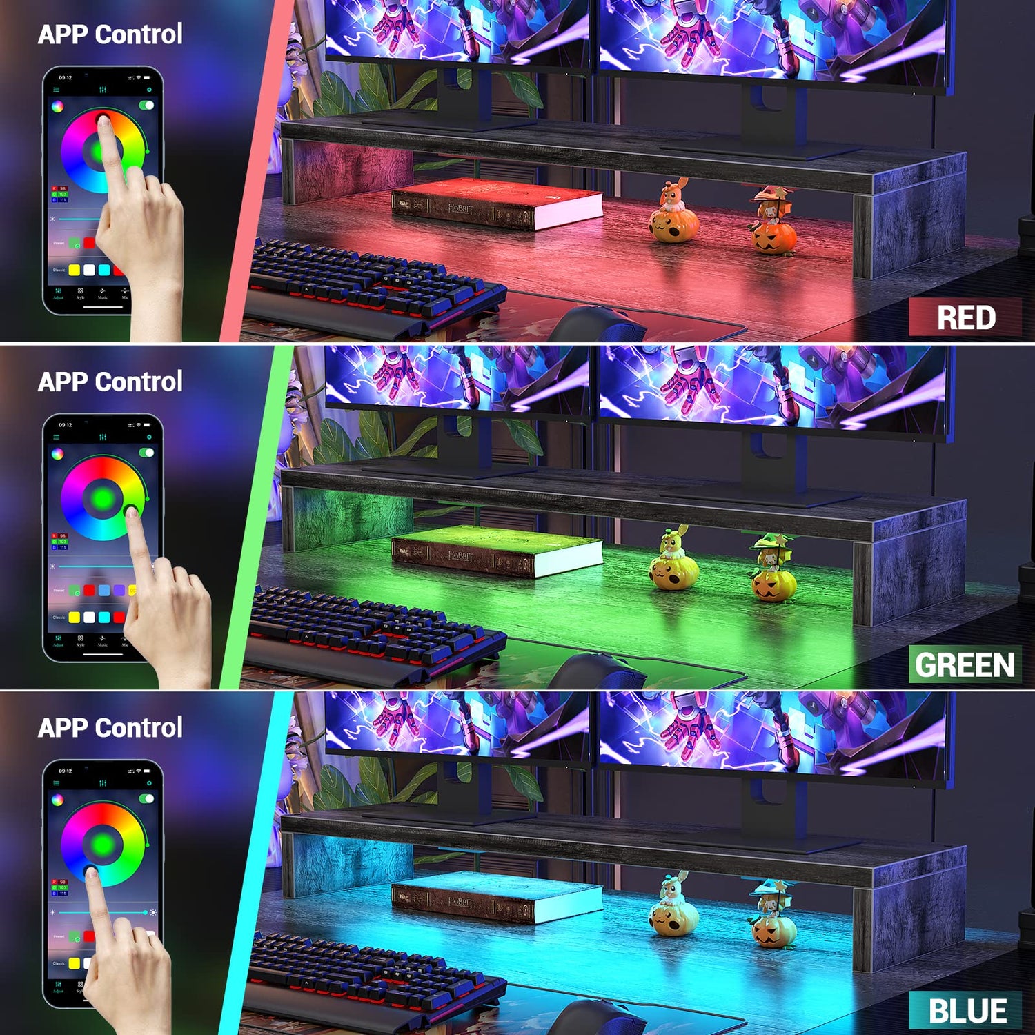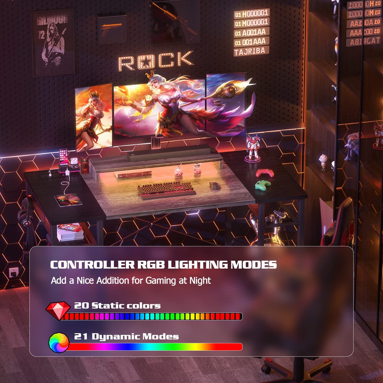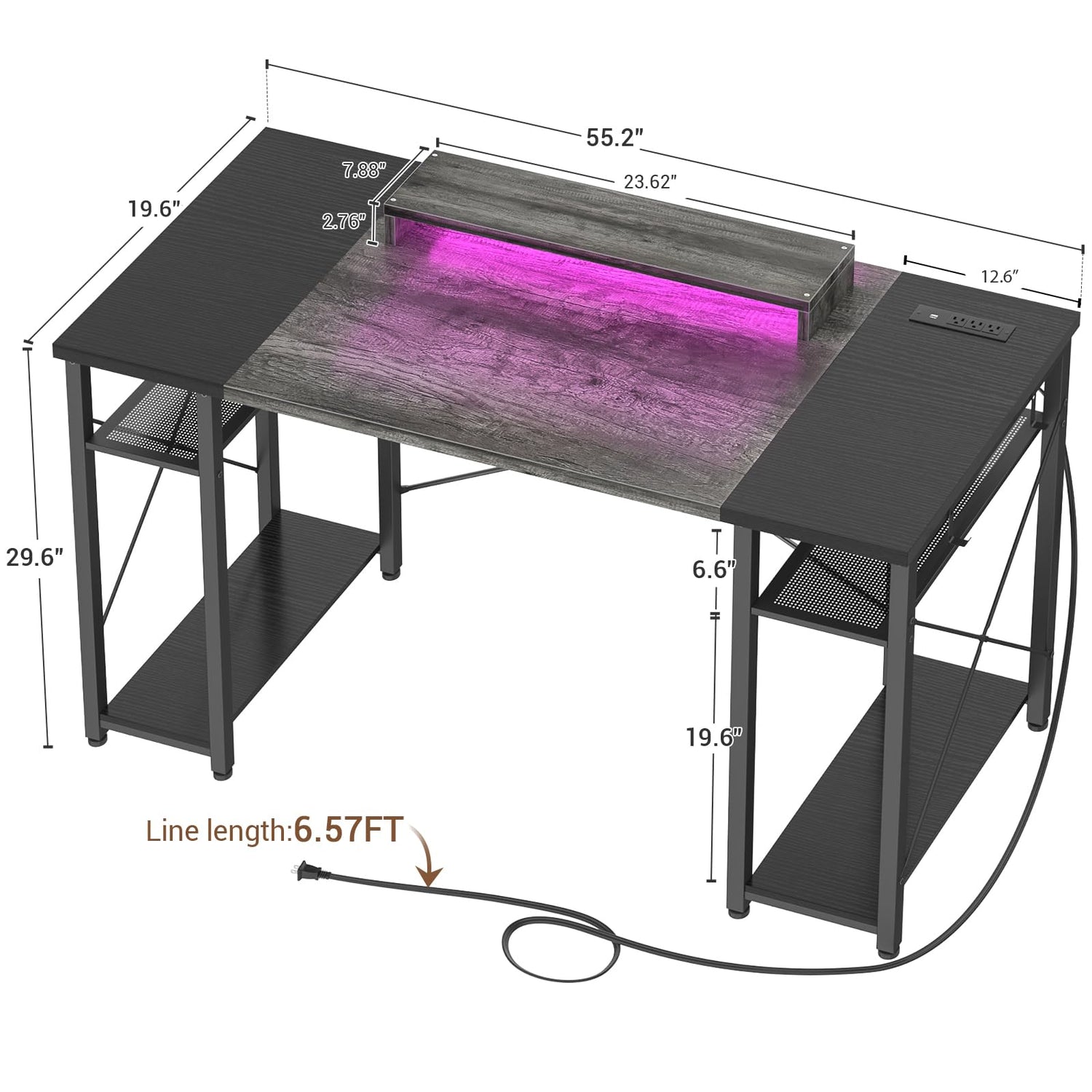 armocity Computer Desk with LED Lights, 55 Inch Desk with Power Outlet and USB, Reversible Large Desk with Moveable Monitor Stand, 55.2'' Gaming PC Table for Home Office, Workstation, Grey and Black