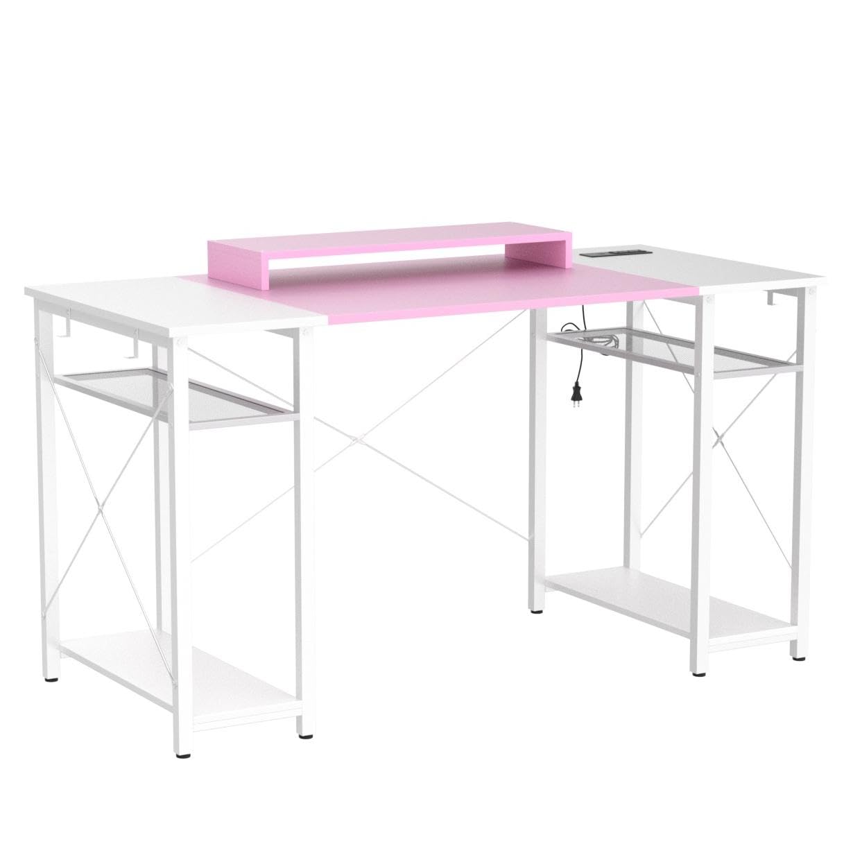 - Splice Board Modern Look - This 55 inch desk has 3 pcs boards which are mixed with white and pink and white, this makes the desk looks modern, special and unique. It also has 4 storage shelves, you can store a lot of things and the leg room is super large.