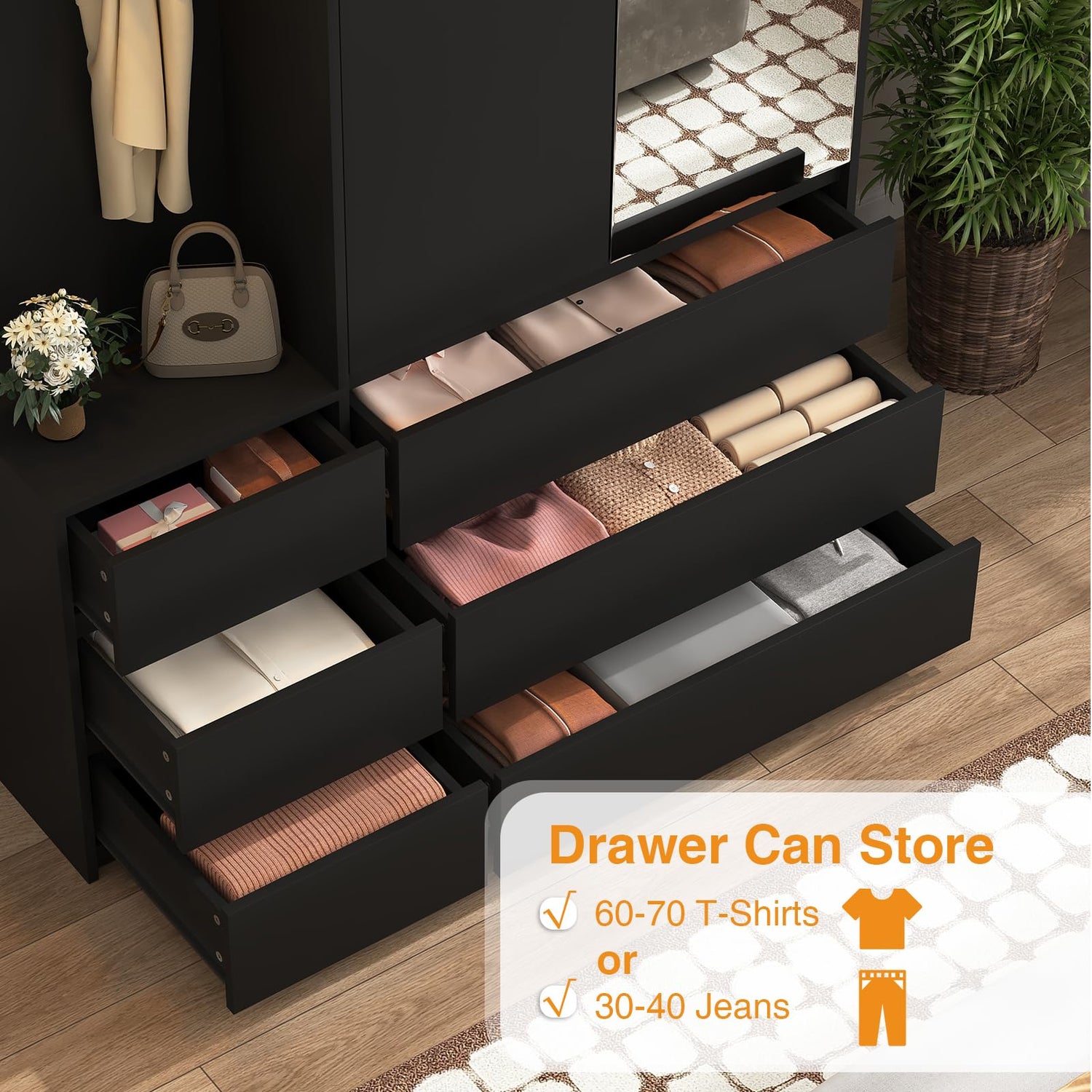 - Clear Half-length Mirror : Elevate your morning routine with a half-length mirror. Not only does it add a touch of elegance to your wardrobe, but it also acts as a practical dressing area, allowing you to see every detail of your outfit before stepping out
