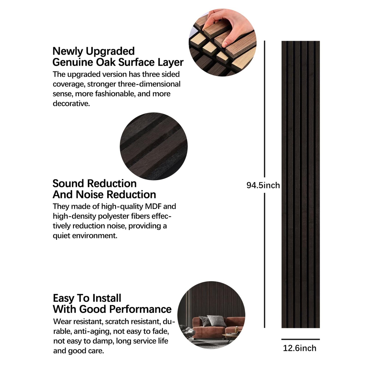 Details: Enhance the aesthetic appeal of your space with our natural walnut wood veneer panels. These modern wall decor panels are not only visually stunning but also offer exceptional functionality. Made from high-quality MDF and high-density polyester fibers, these lightweight panels are durable, safe, and environmentally friendly.Installation is quick and easy, allowing you to transform your walls effortlessly. Measuring 12.6 x 94.5 inches each, 2-pack paneles decorativos para pared provide a total coverage of 16.5 sq.ft. With their fluted texture, they add a touch of sophistication to any room. Whether you're looking to create a stylish office wall decor or elevate your wall decor for living room, these solid wood veneer sheet acoustic wall panels are perfect for you. Our wall paneling for interior wall are not just visually appealing but also sound absorbing. They effectively reduction noise, providing a quiet environment. The formaldehyde-free composition ensures no harmful chemical emissions, making them safe for your health. Additionally, the low TVOC levels further contribute to a healthier indoor atmosphere.Ideal for wall accents, room decor wall, modern apartment decor and TV background wall panel, these slat wall paneling are versatile and fashionable. The natural wood paneling adds warmth and elegance to your space. These noise cancelling wall panels are perfect for both residential and commercial settings.Don't compromise on style or functionality when it comes to your wall decor. Choose our natural wood veneer acoustic panels sound absorbing and create a stunning, soundproof, and eco-friendly interior. Elevate your space today!