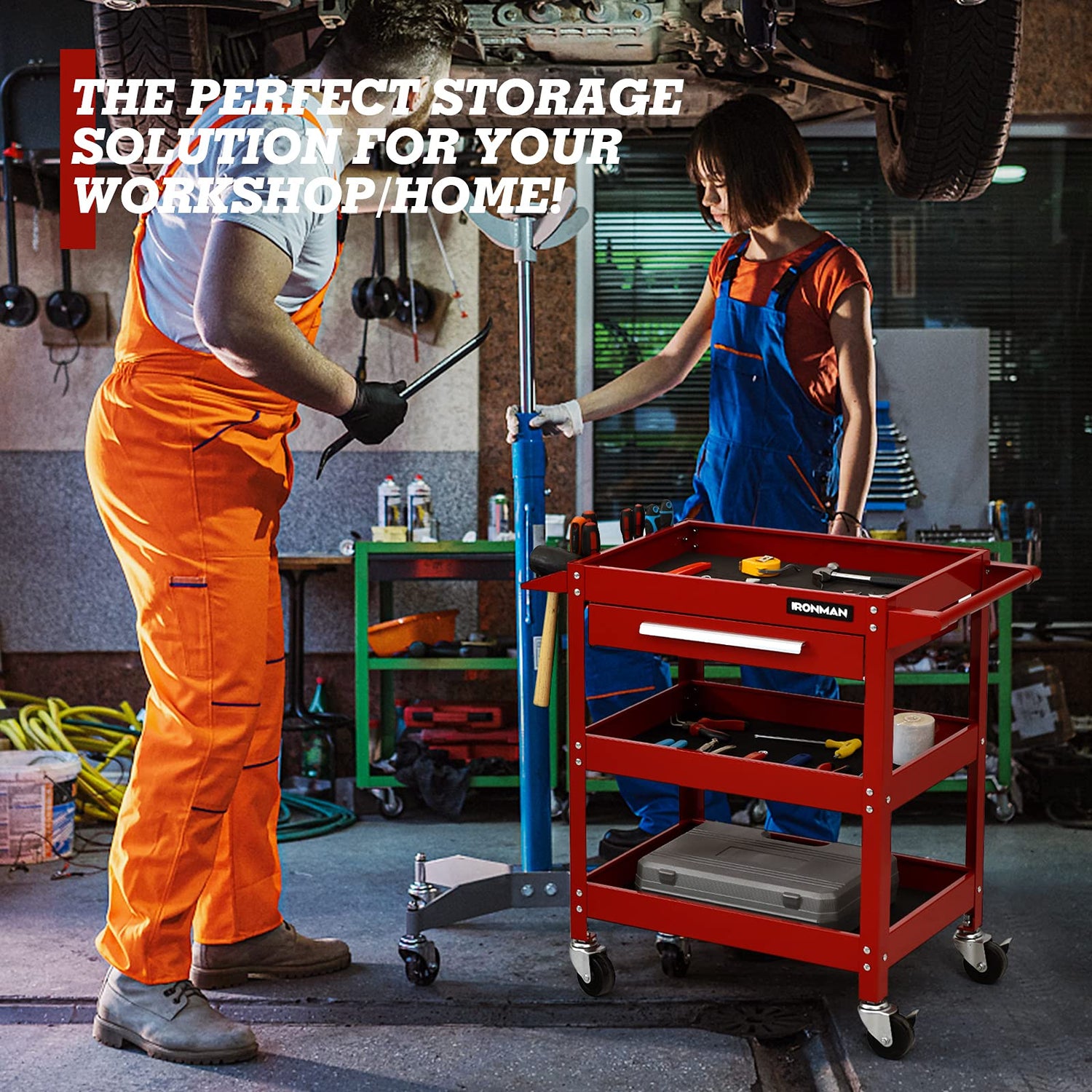 Details: Why do you need a tool cart?Here's why a tool cart is such a necessity.Your tools are in a convenient location, ready to use when you need them.An organized tool cart structure can make your work faster and more efficient.Keeping your tools in a drawer will protect them and reduce the risk of damageA reinforced or stainless steel work surface and caster support for increased mobility and storage capacityLet ARNOT's compact and durable adjustable carts organize your garage, store or storage area. Keep your small tools from getting lost in the clutter of your toolbox with the ARNOT 3-drawer tool cart.Large enough for storage, but compact enoughStrong coating finish to prevent rust and scratchesEach top is covered with non-slip premium rubber for extended tool lifeAll-steel construction and enlarged push bar side handles for stability and comfortBall bearing slide drawers for easy pulling4 heavy-duty casters (2 locking brakes) for smooth transport of materialsThe product includes a small wrench for caster installation, more convenient for customers to install.SpecificationsMaterial: SteelColor: RedOverall dimension: 31.5" x 16" x 31.5" (L x W x H)Drawer dimension: 21" x 15" x 3" (L x W x H)Product net weight: About 37 lbsWeight capacity: 330 lbsPackage includes:1 x Three-tray tool cart 1 x InstructionNote: 100% SATISFACTION OR YOUR MONEY-BACK , If you have any problems with our product, please contact with us first, we will solve it for you within 24 hours.