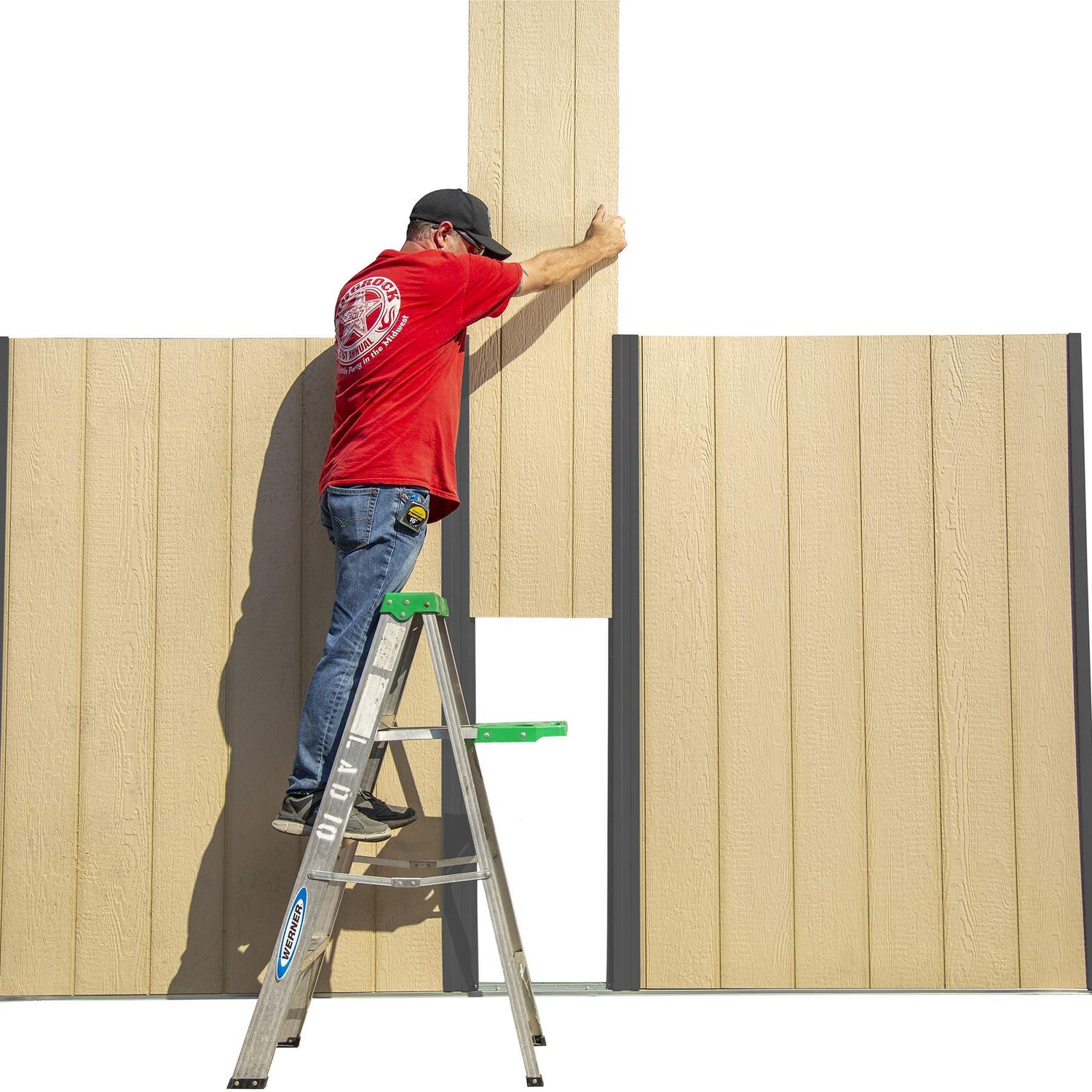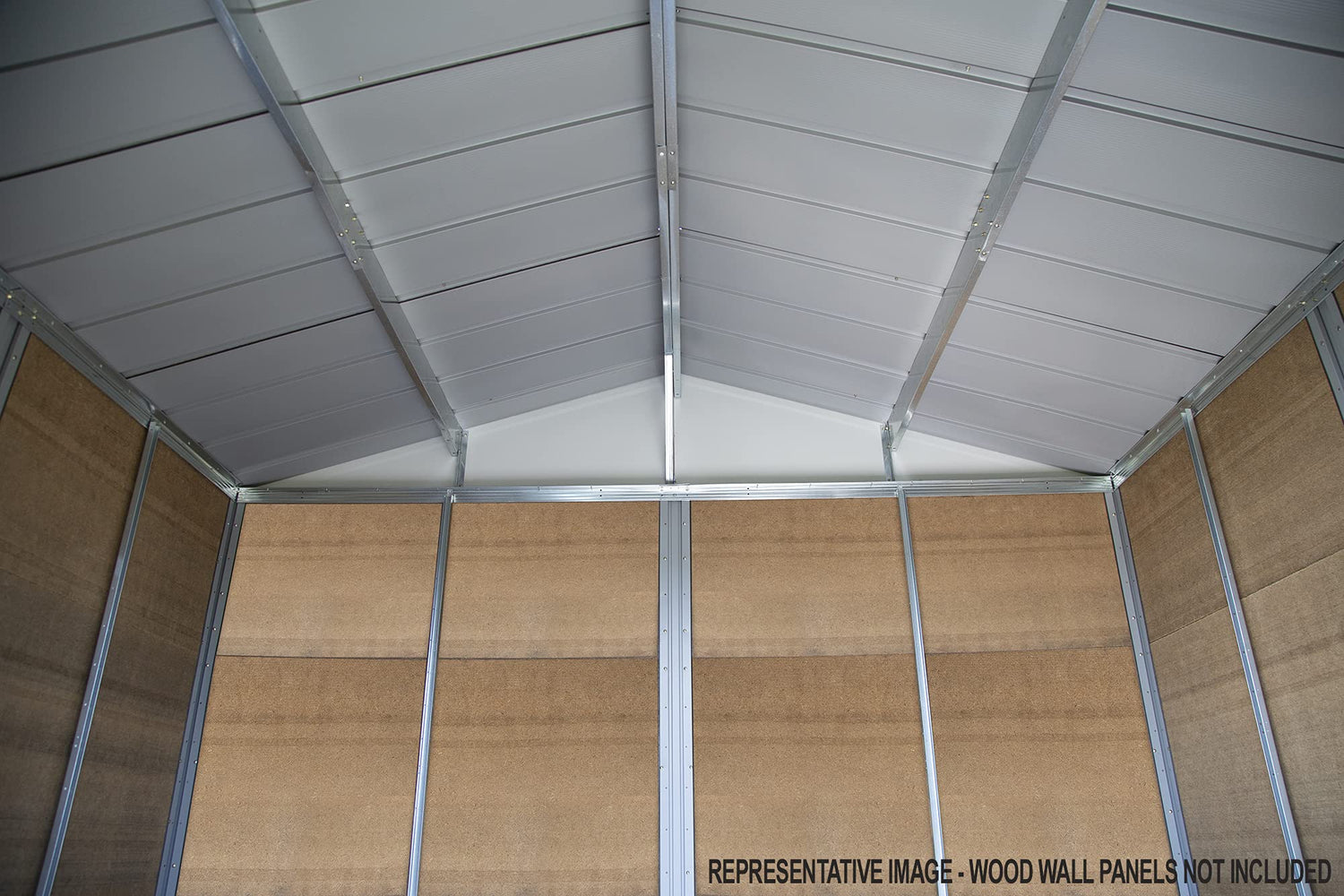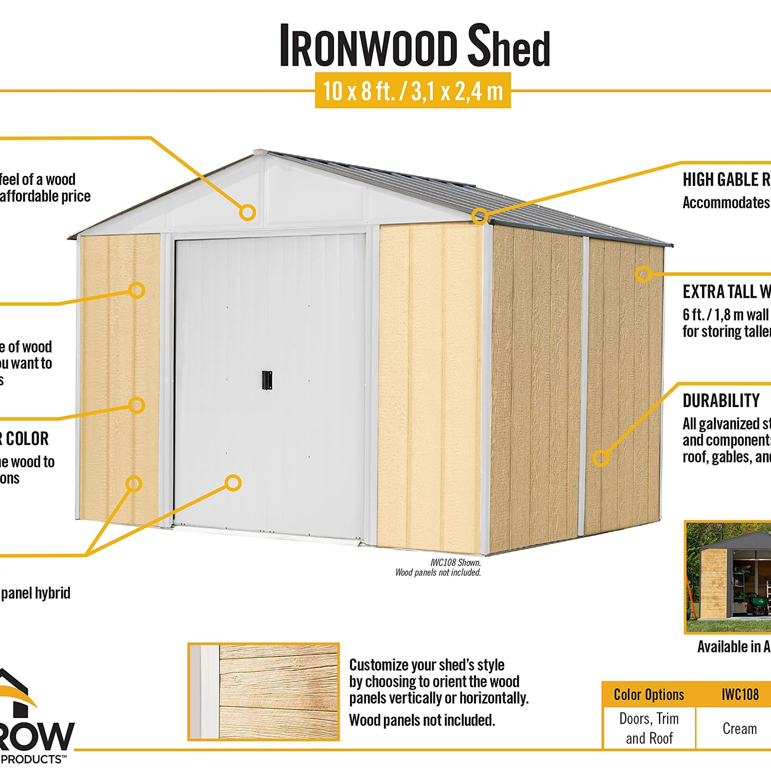 Details: Build a customized outdoor storage solution with the Arrow Ironwood Steel Hybrid 10' x 8' Shed Kit. This Arrow backyard storage shed has nearly all you need to build your own shed to your specifications. You'll get the great look and feel of a wood shed at a more affordable price with this steel and wood panel hybrid shed. This kit includes all the steel components you'll need to build the frame of your shed. Design your perfect shed and then purchase the wood paneling that best fits your style (wood paneling sold separately - available at most Home Improvement Stores). Arrow recommends purchasing 3/8" exterior grade wood siding panels. Then, stain and treat your wood with an outdoor finish, and choose your shed's design orientation (vertical or horizontal). Your shed kit features all-steel parts where you need it most in your garden shed. It features strong hot dipped galvanized steel support beams and frame for enhanced corrosion resistance and strength. The 6' tall wall height and high gable shed gives you ample storage height that allow you to store bulk items and allows for easy access. Perfect for storing taller items like ladders, lawn mowers, and garden tools. This durable and reliable shed features a wide 4'6" doorway, making it easy to access and store your items. With lockable sliding doors, your stored items will be kept safe and secure. There's up to 74 square feet of storage space available. Get a great, affordable Arrow backyard shed kit today! Includes a 12 year limited on all steel parts. ASSEMBLED EXTERIOR DIMENSIONS: 7'9" x 10'3" x 7'5"INTERIOR DIMENSIONS: 7'6" x 7'4" x 9'9"DOOR DIMENSIONS: 4'6" W x 5'9" HTOTAL STORAGE AREA: 74 feet INCLUDES: Frame Door Roof Instruction Manual**Please note the wood panels are not included to complete your shed. Pick your own look and design. Wood panels can be purchased at most Home Improvement stores.