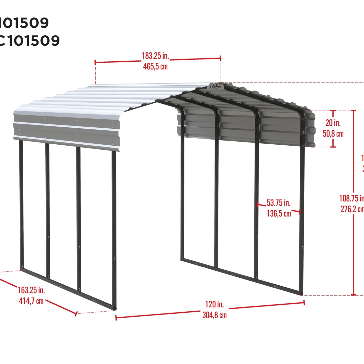 - DIMENSIONS: The fully assembled Arrow Sheds steel carport measures 120" W x 183.25" D x 123.15" H, or 10' W x 15' D x 9' H; this unit contains 4 packages: you will receive 3 frame cartons and 1 roof panel carton