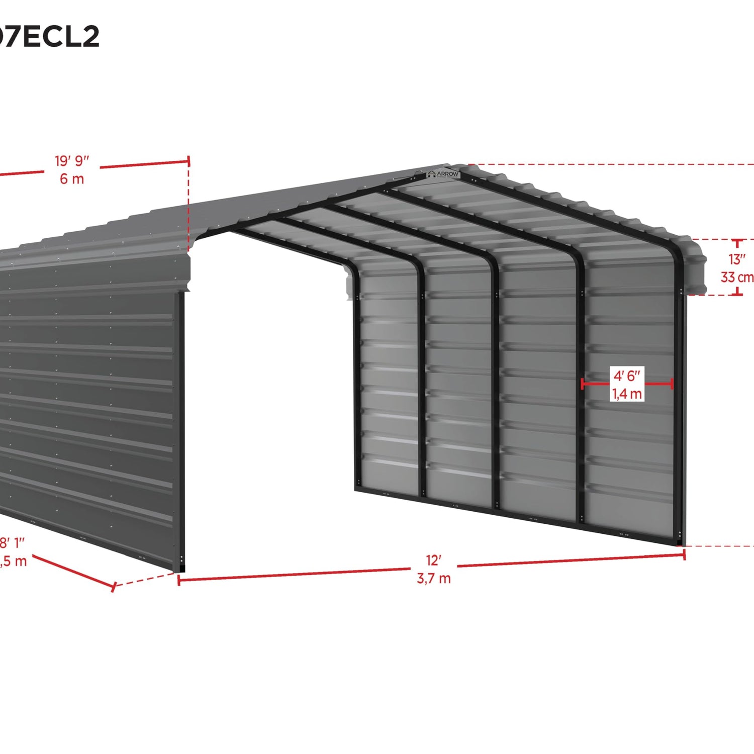 - DIMENSIONS: The fully assembled Arrow Sheds steel carport measures 146" W x 237" D x 102" H, or 12' W x 20' D x 7' H; this unit contains 7 packages: 2 frame cartons, 1 roof panel carton, and 4 enclosure panel cartons