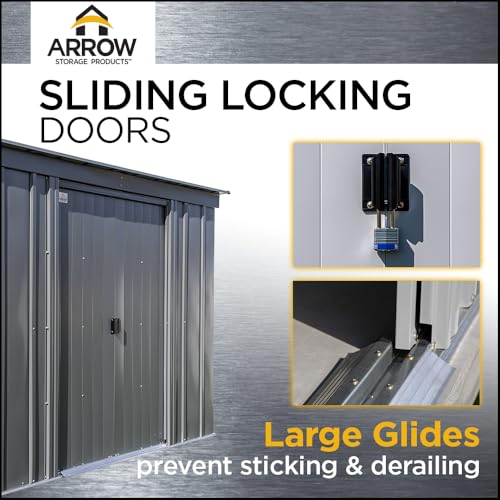 - FUNCTIONAL STORAGE: Low gable roof pitch is designed to prevent water from pooling, while sliding doors sit on large glides that prevent sticking and derailing