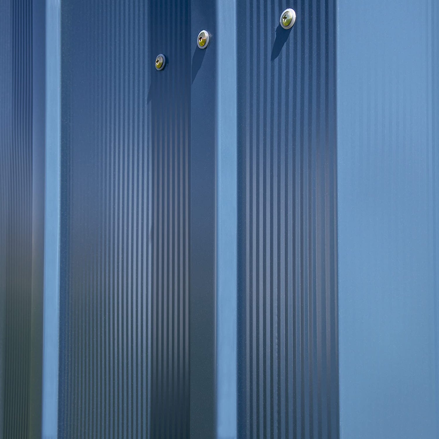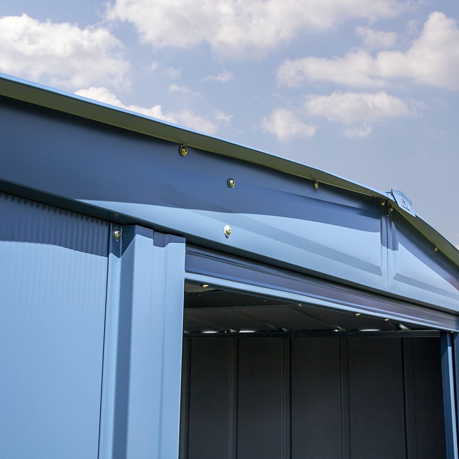 Details: Add functional and practical storage space with the Arrow Classic Outdoor Padlockable Steel Storage Shed. This 10’ x 8’ steel storage building is engineered to protect your yard and landscaping equipment, tools, gardening supplies, and garage overflow items. Constructed from a durable and heavy duty galvanized steel, the Arrow Classic Storage Shed is a long-lasting storage option for your property. The galvanized steel provides superior protection against corrosion, rust, and nature’s elements. Finished in a smooth and hard-wearing Valspar exterior polyester paint, this helps provide additional safeguarding against rust and corrosion by sealing the steel. This reliable and functional storage building is designed with a low gable roof pitch to prevent the pooling of water, making it last longer and protecting the shed’s roof. Two sliding doors allow easy access to the interior of your storage shed. The sliding shed doors sit on large glides that help prevent sticking and derailing. For added convenience and security, the sliding doors are padlockable to help prevent theft of your lawn mower, bike, and other stored items. It also has 65 inch tall vertical wall panels to help store taller items. If you're storing wide or bulky items lawn equipment or patio furniture, you'll appreciate the wide 55.5 x 63 inch high shed entrance. Not only is it sturdy, functional, and built to last, the Arrow Classic Shed is designed to add aesthetic appeal to your property. It has a neutral Blue Grey finish to effortlessly complement your home and yard. It pairs seamlessly with a wide range of home colors at a fraction of the price of a brick and mortar structure. The Arrow Classic Shed comes ready to assemble with pre-cut and pre-drilled parts. We recommend at least 2 people for assembly and to set aside 6+ hours. Proudly made in the USA with globally sourced material. The outside metal storage shed measures 123.25" W x 95.25" D x 75.88" H with 74 sq. feet of storage space.