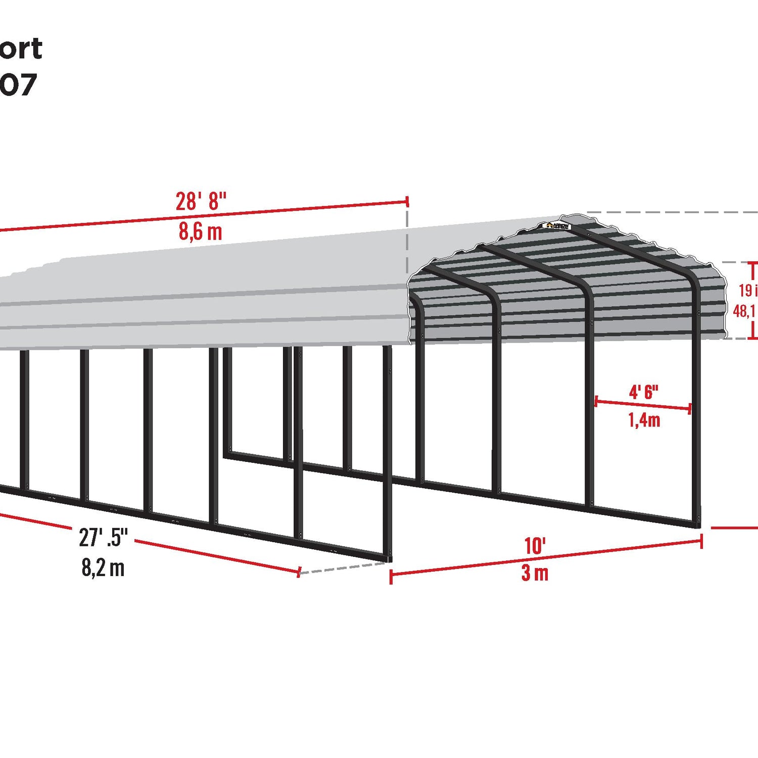 - DIMENSIONS: The fully assembled Arrow Sheds steel carport measures 120" W x 344.5" D x 98.4" H, or 10' W x 29' D x 7' H; this unit contains 9 packages: you will receive 5 frame cartons and 4 roof panel cartons