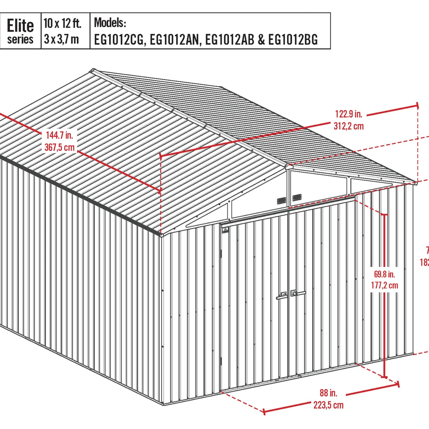 Details: The Arrow Elite Outdoor Lockable Steel Storage Shed Building will add an attractive and functional storage space. This 10’ x 12’ steel storage building is engineered with a premium steel material to provide superior protection for your stored tools, gardening supplies, and lawn equipment. Constructed from Galvalume, an aluminum and zinc plated steel, the Arrow Elite Storage Shed is a long-lasting storage option for your property. This plated steel is highly anti-corrosive. This reliable storage building is designed with a tall gable roof for added headroom and a squared wall design for a sleek look. The metal shed features tall 72" vertical wall panels to help store taller items and provide adequate walk around space. With the 63.44" W x 69.77" H shed entrance, you can easily access the shed's interior and retrieve items effortlessly. The reinforced and sturdy wide door allows easy access to the interior of your storage shed, while also allowing storage against the front wall. Protect your items from theft with the lockable swing shed door, which features a brushed nickel key lock handle. In addition, gable vents provide increased air flow to the shed's interior. The Arrow Elite Shed comes ready to assemble with pre-cut and pre-drilled parts. Proudly manufactured in the USA with globally sourced material. The storage shed measures 144.7" D x 122.9" W x 91.4" H with 117 sq. feet of storage space.