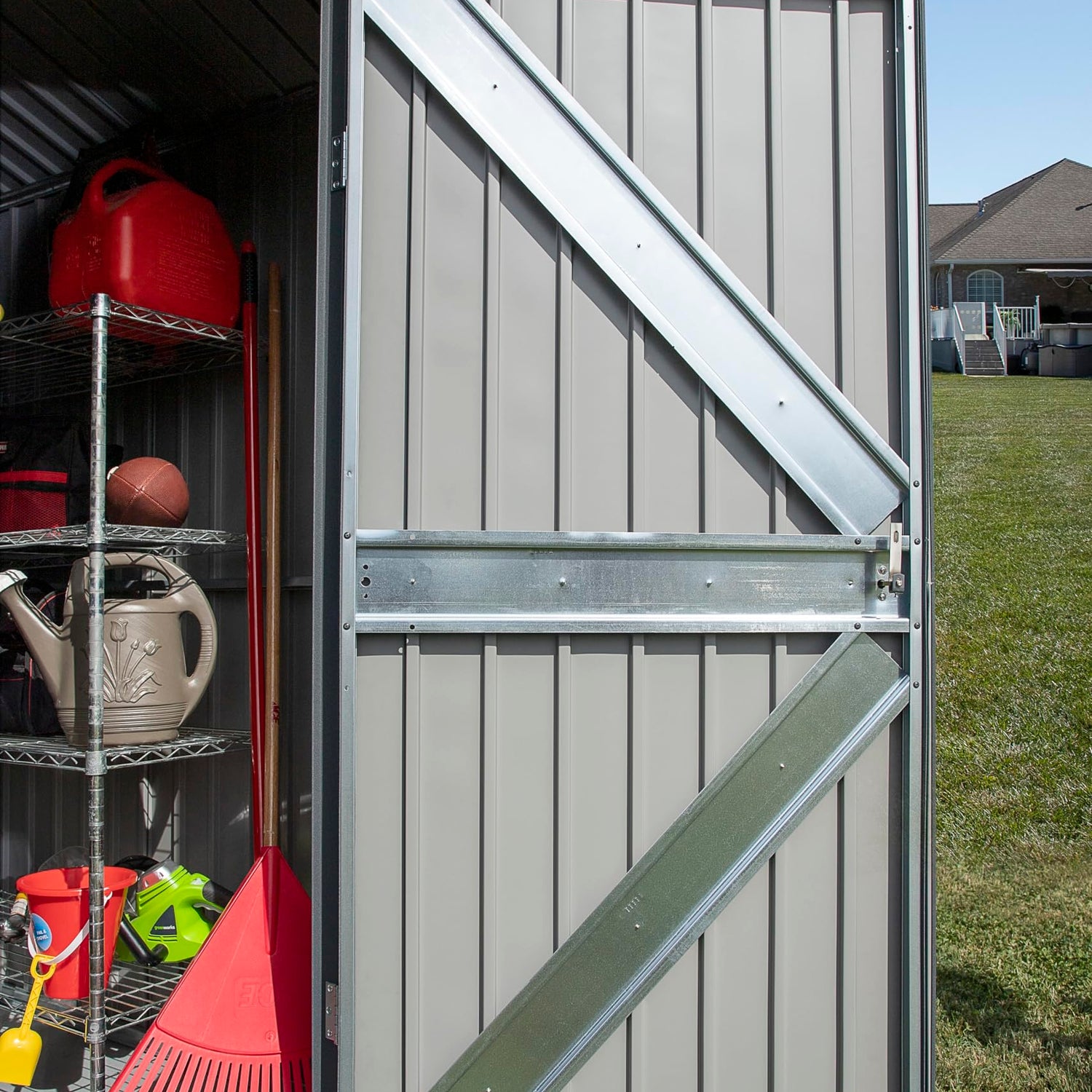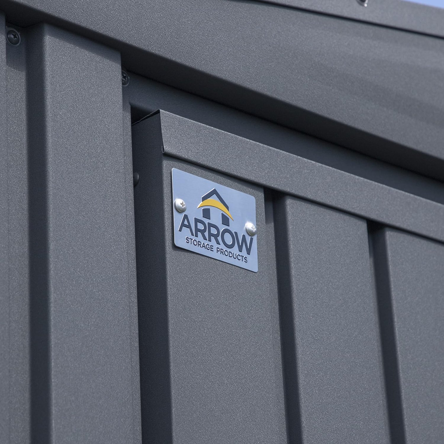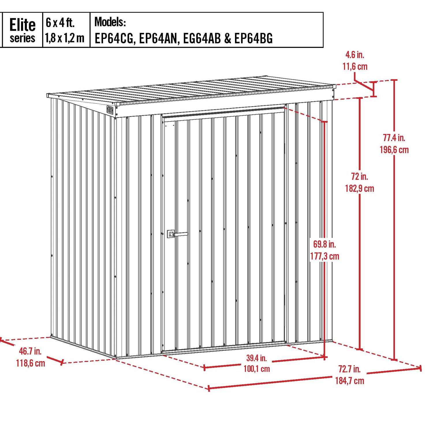 Details: The Arrow Elite Outdoor Lockable Steel Storage Shed Building will add an attractive and functional storage space. This 6’ x 4’ steel storage building is engineered with a premium steel material to provide superior protection for your stored tools, gardening supplies, and lawn equipment. Constructed from PermaPlate, an aluminum, zinc, and silicon plated steel, the Arrow Elite Storage Shed is a long-lasting storage option for your property. This plated steel is highly anti-corrosive. Finished in a wrinkle paint textured finish, this helps provide additional safeguarding against harmful weather, rust, and corrosion. This reliable storage building is designed with a tall pent roof for added headroom and a squared wall design for a sleek look. The metal shed features tall 72 inch vertical wall panels to help store taller items and provide adequate walk around space. With the 39.4 inch wide x 69.77 inch high shed entrance, you can easily access the shed's interior and retrieve items effortlessly. The reinforced and sturdy wide door allows easy access to the interior of your storage shed, while also allowing storage against the front wall. Protect your items from theft with the lockable swing shed door, which features a brushed nickel key lock handle. You can store your lawn mower, seasonal patio furniture, pool accessories, and more with peace of mind. In addition, gable vents provide increased air flow to the shed's interior. The shed is designed to add aesthetic appeal to your property and has a neutral Anthracite finish to effortlessly complement your home and yard. It pairs seamlessly with a wide range of home colors and gives a modern appearance. The Arrow Elite Shed comes ready to assemble with pre-cut and pre-drilled parts. We recommend at least 2 people for assembly and to set aside 6+ hours. Proudly made in the USA with globally sourced material. The outside storage shed measures 72.7" W x 46.7" D x 77.4" H with 21 sq. feet of storage space.