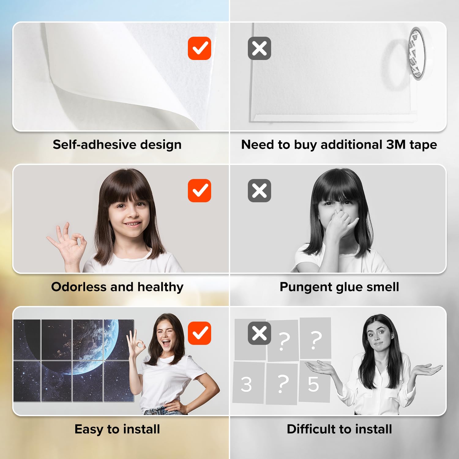 - 【Easy Installation, No Hassle】Our soundproof wall art panels feature with self-adhesive glue on the back, you can quick and easy to install, with no major renovation required. Simply hang them on your walls or ceiling to improve acoustics, transforming your space effortlessly—saving you time and effort.