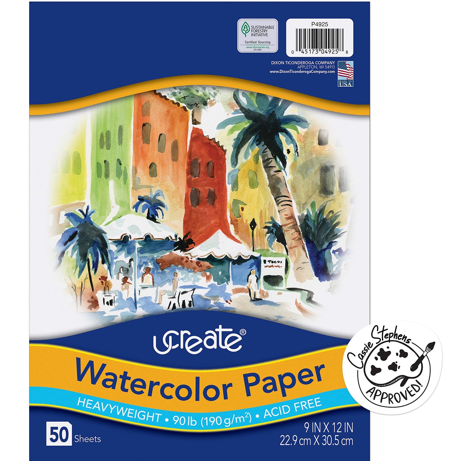 "This 90 lb. watercolor paper in economical packages is perfect for Pre-K and student grade artwork. These sturdy sheets have a uniform texture and whiteness, and are ideal for wet and mixed media. This 9-inch by 12-inch pad includes 50 sheets of 90 lb. paper that is both acid-free and recyclable. UCreate Watercolor Paper is used in Fresh Artists programs which benefit children in under resourced schools."