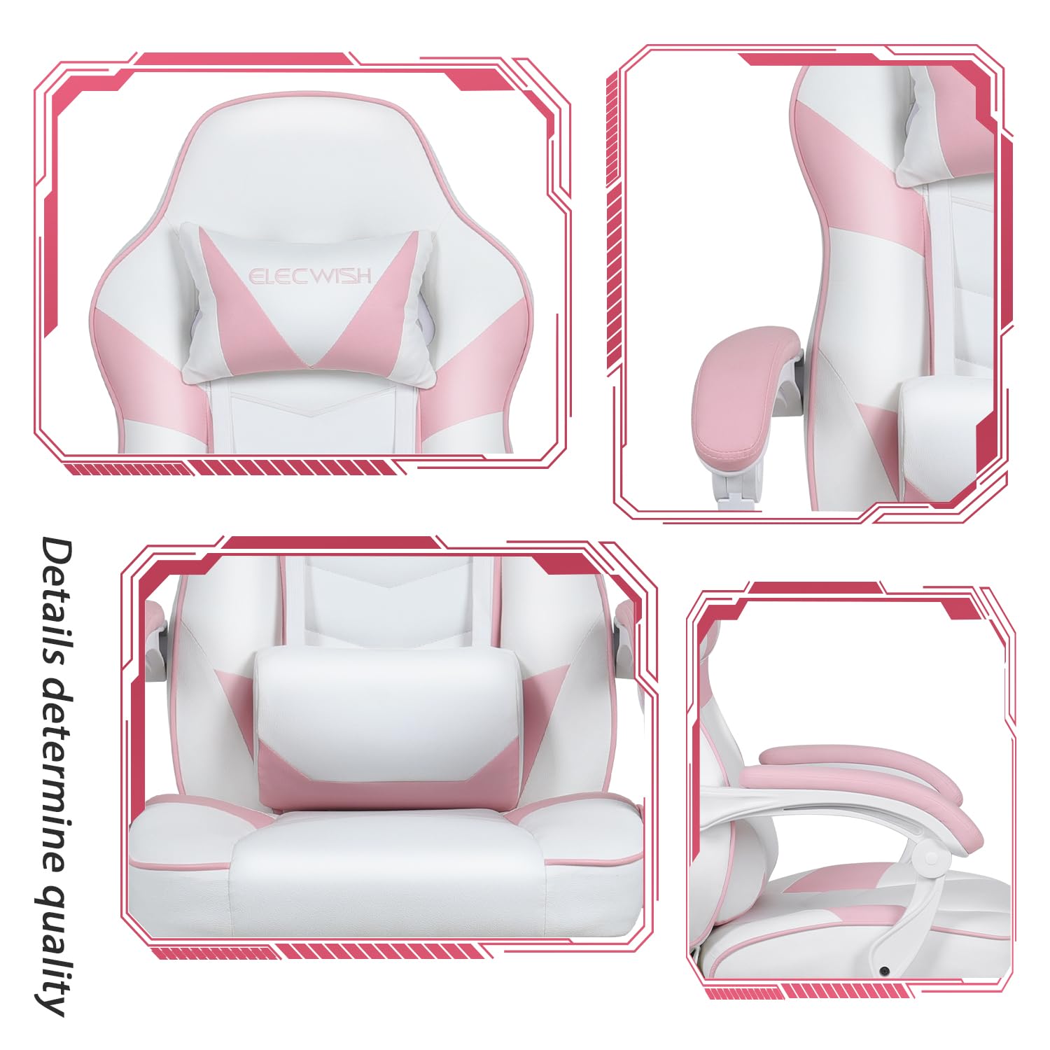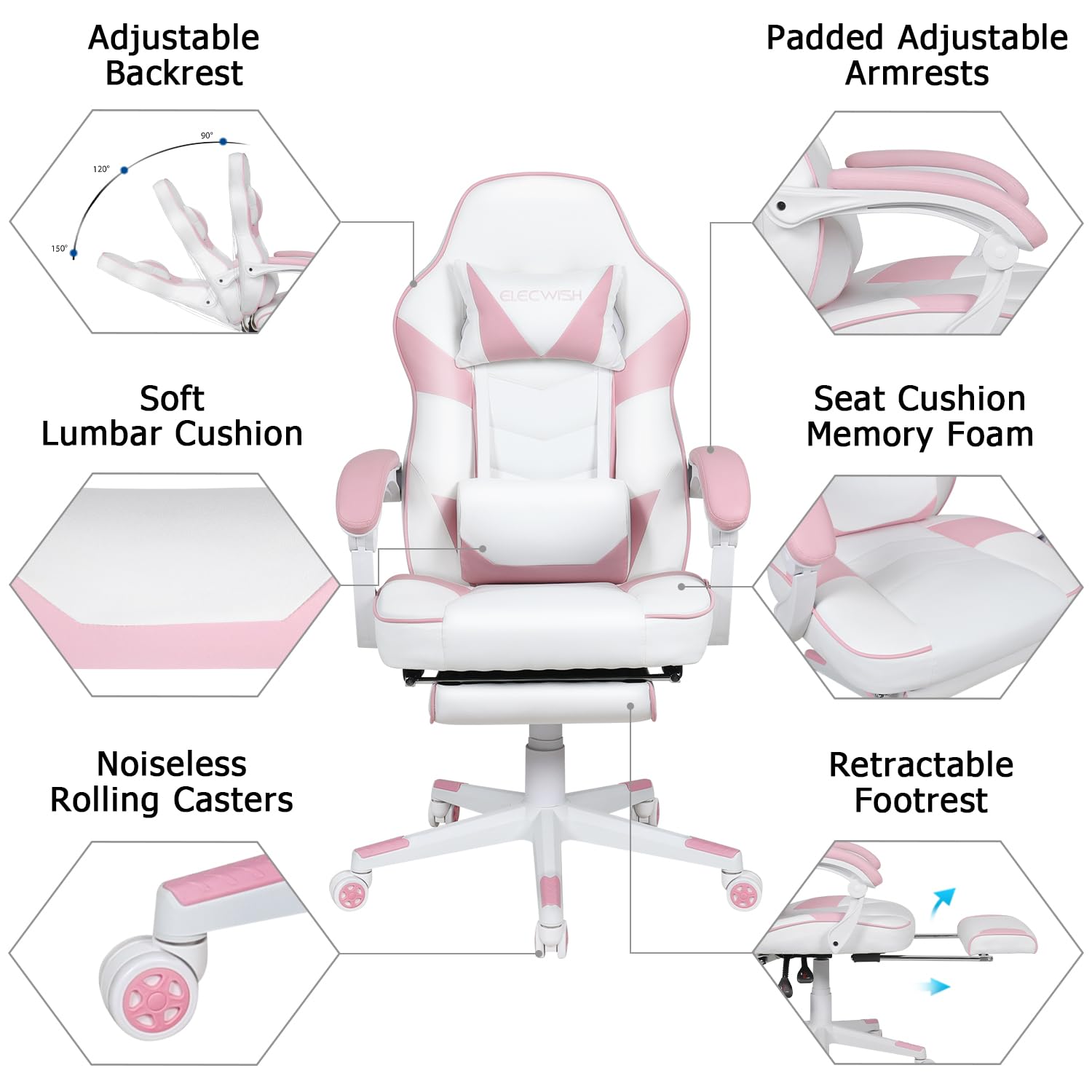 ARTETHYS Gaming Chair, Ergonomic High Back Racing PU Leather Computer Chair with Adjustable Footrest, Headrest and Lumbar Support and 90 to 150 Degree Tilt Pink