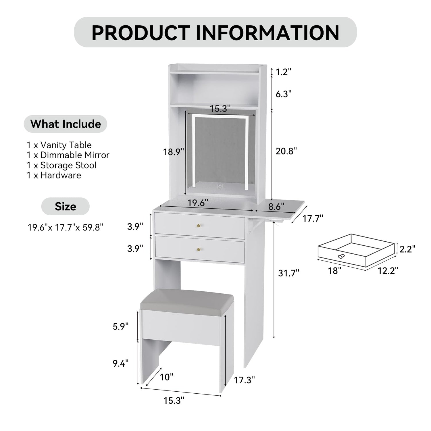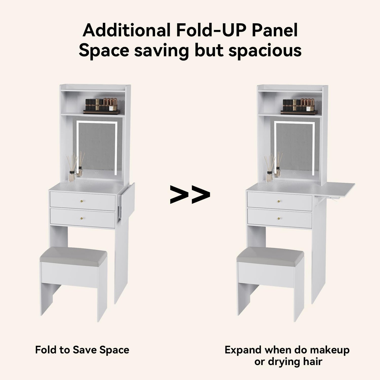 ARTETHYS Small Vanity Desk Set with 3 Adjustable Lighted Mirror and Storage Chair, Makeup Vanity Table for Small Space, White Dressing Table with Fold-up Panel for Bedroom