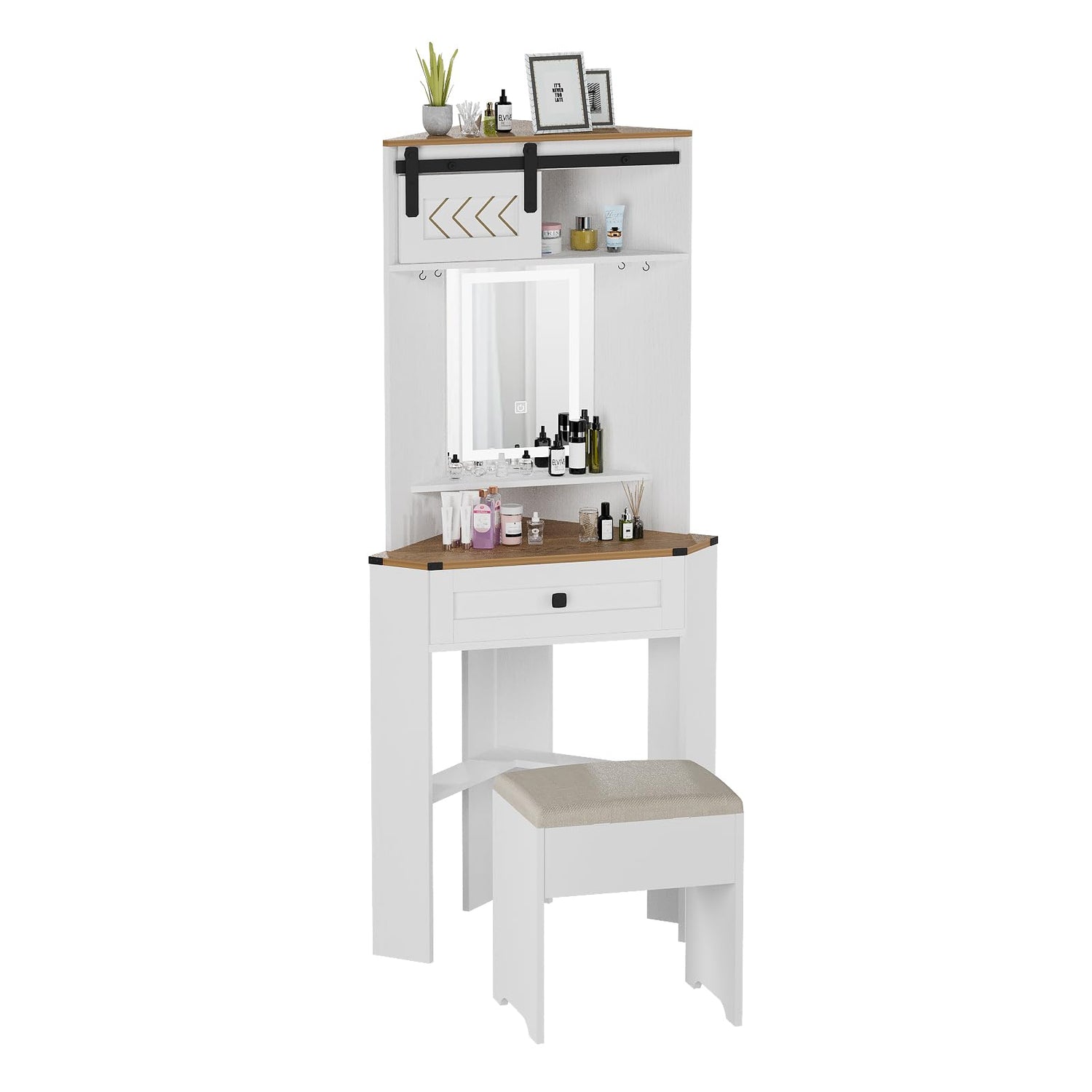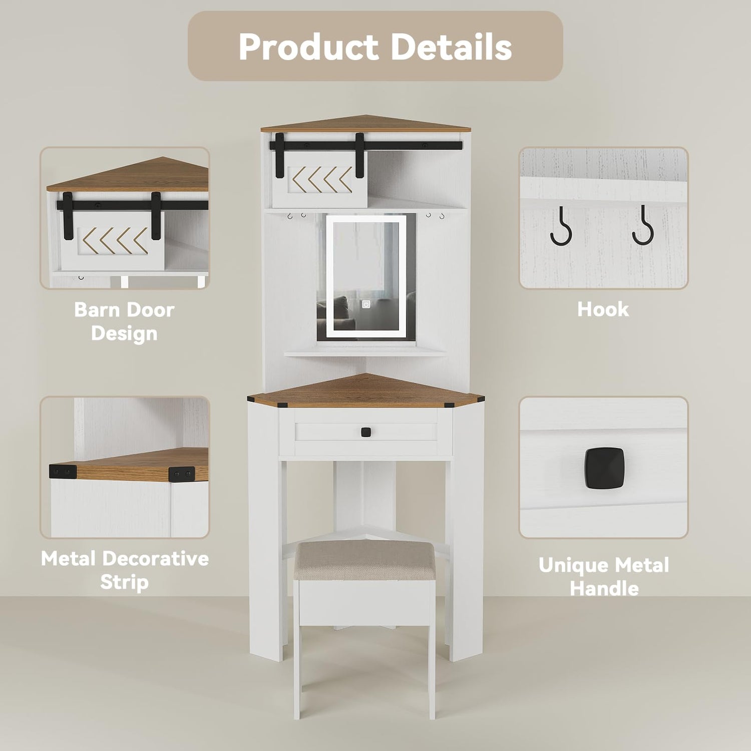 - Small but Large Capacity: This white dressing table with barn door comes with one drawer and 6 hooks, a storage vanity stool, providing ample storage space