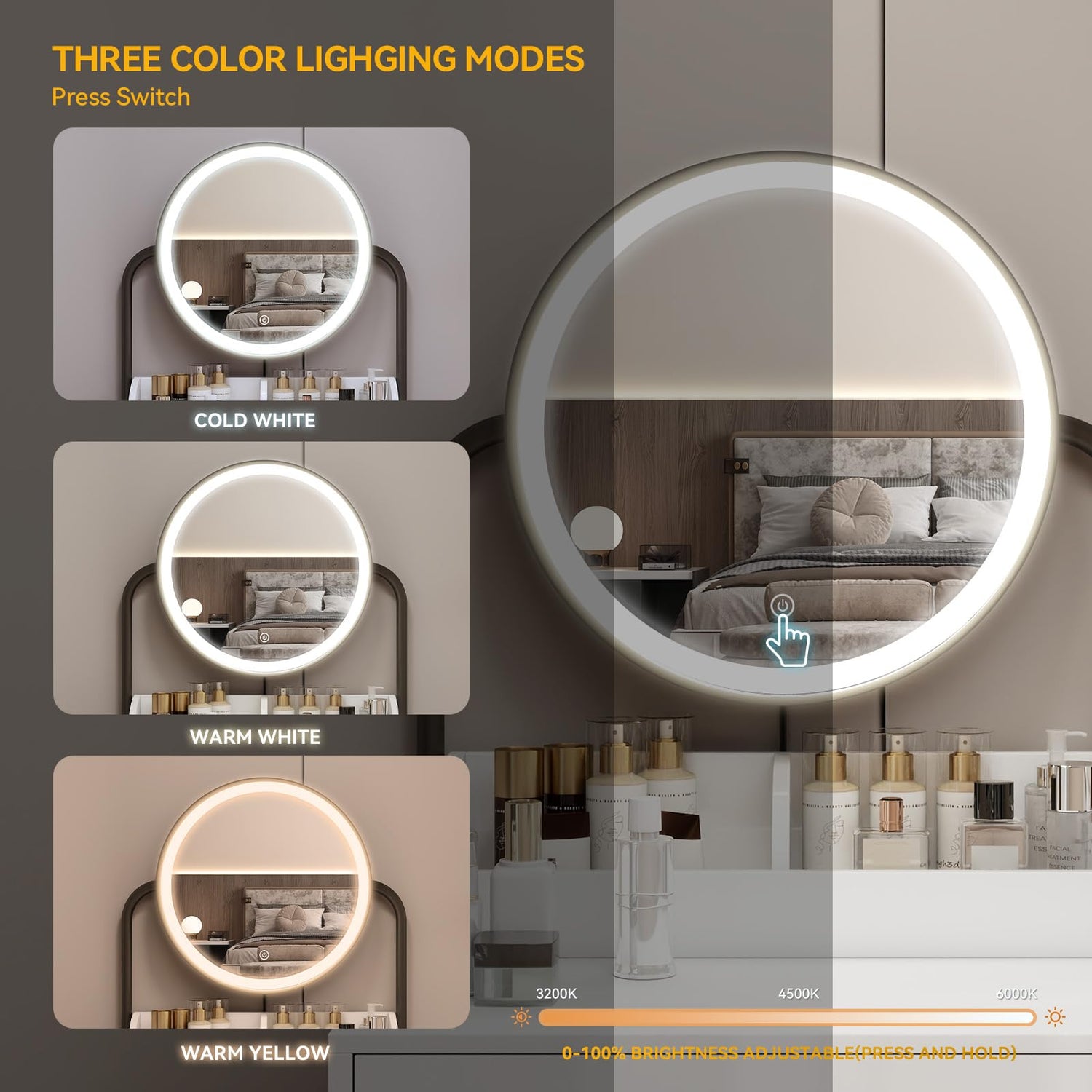 - Adjustable Mirror: This narrow girls vanity set comes with a charming black mirror with LED light, which provides 3 color modes: warm yellow, natural light, and bright white. Long press the touch switch to adjust the light brightness of each mode, it can meet your different needs and is perfect for home, salon, or live broadcast