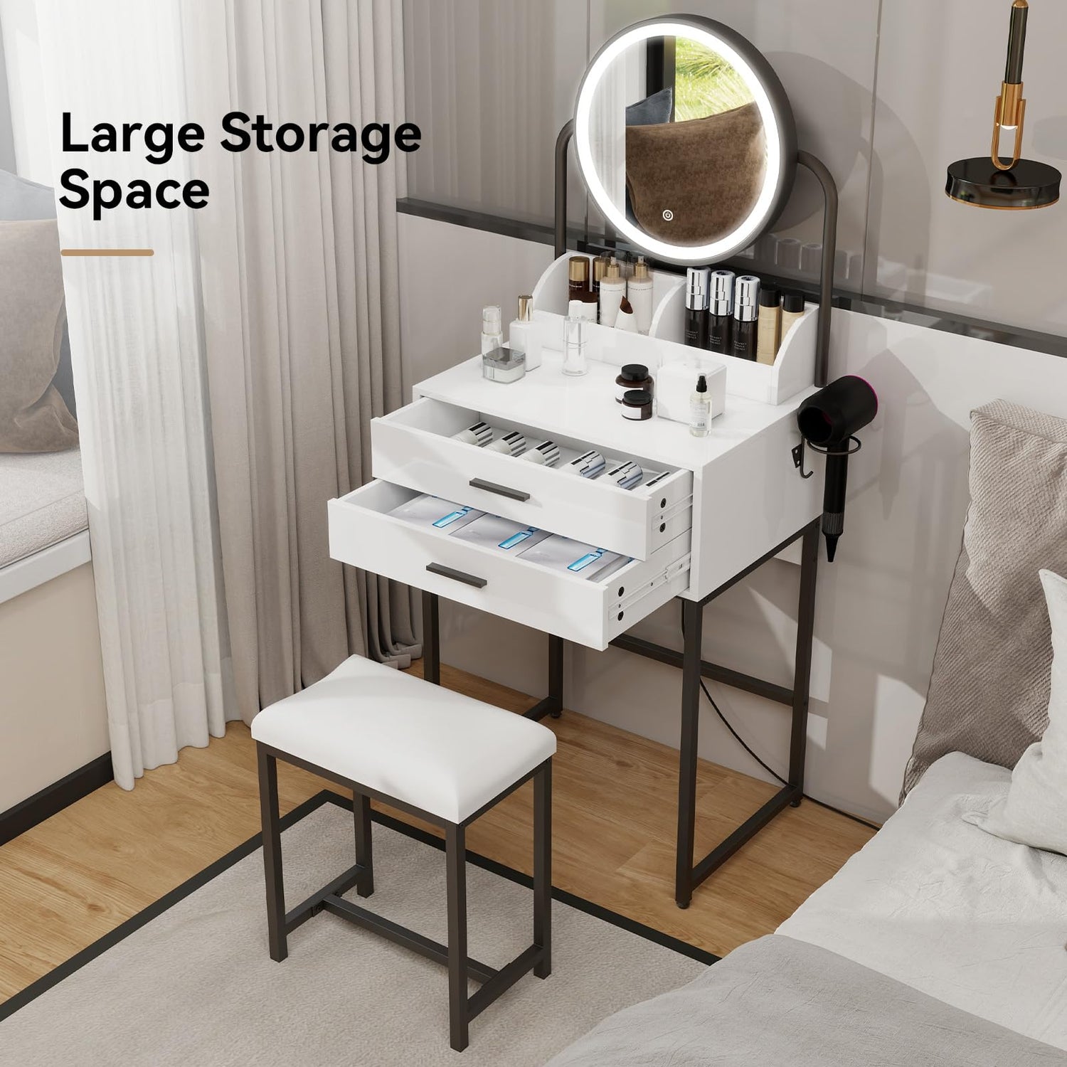 - Compact Size & Ample Storage: Equipped with 2 makeup organizers on the tabletop, and 2 large drawers, this compact light-up led vanity set provides ample storage solutions for all your cosmetics, hair tools, and jewelry, making it easy to keep everything organized and within reach