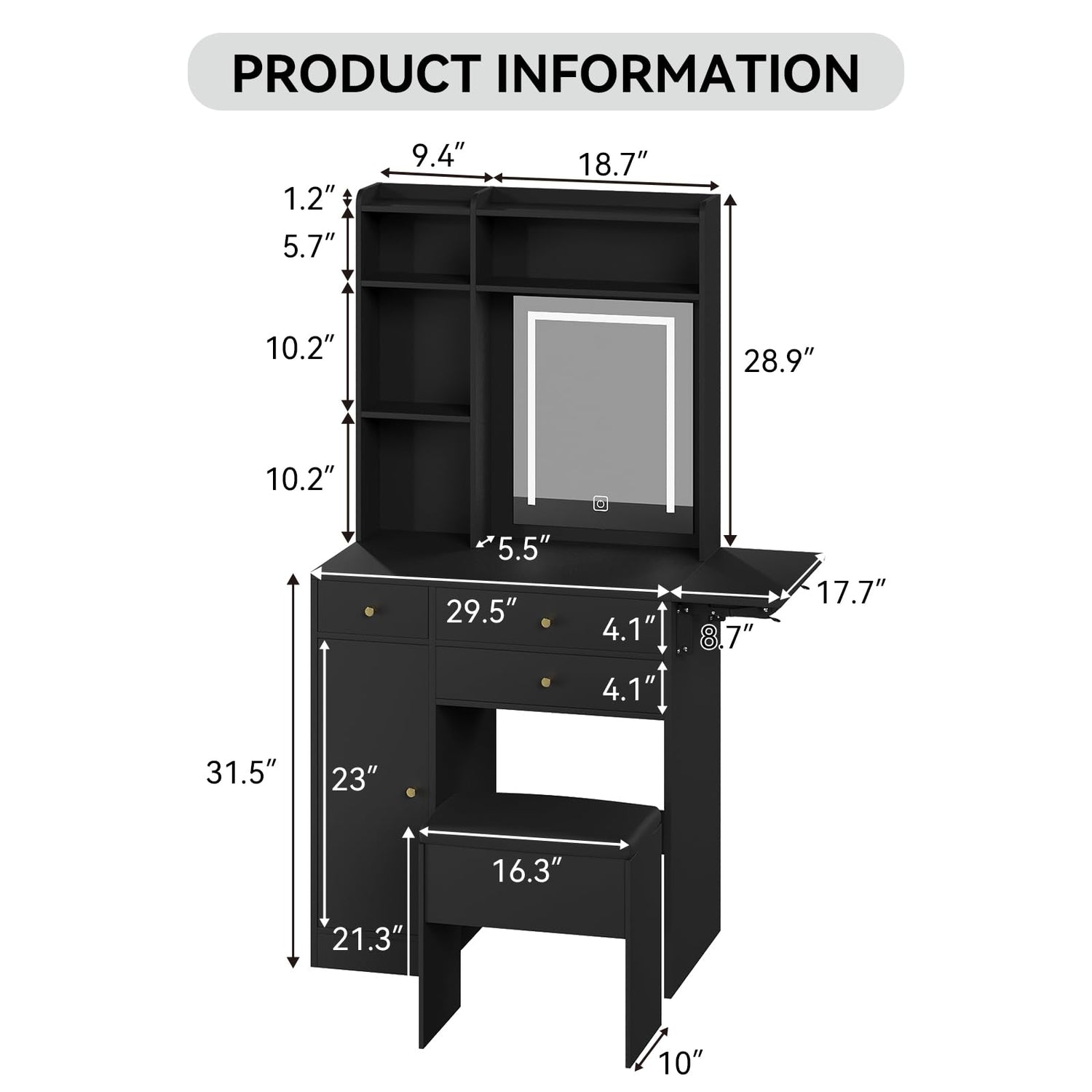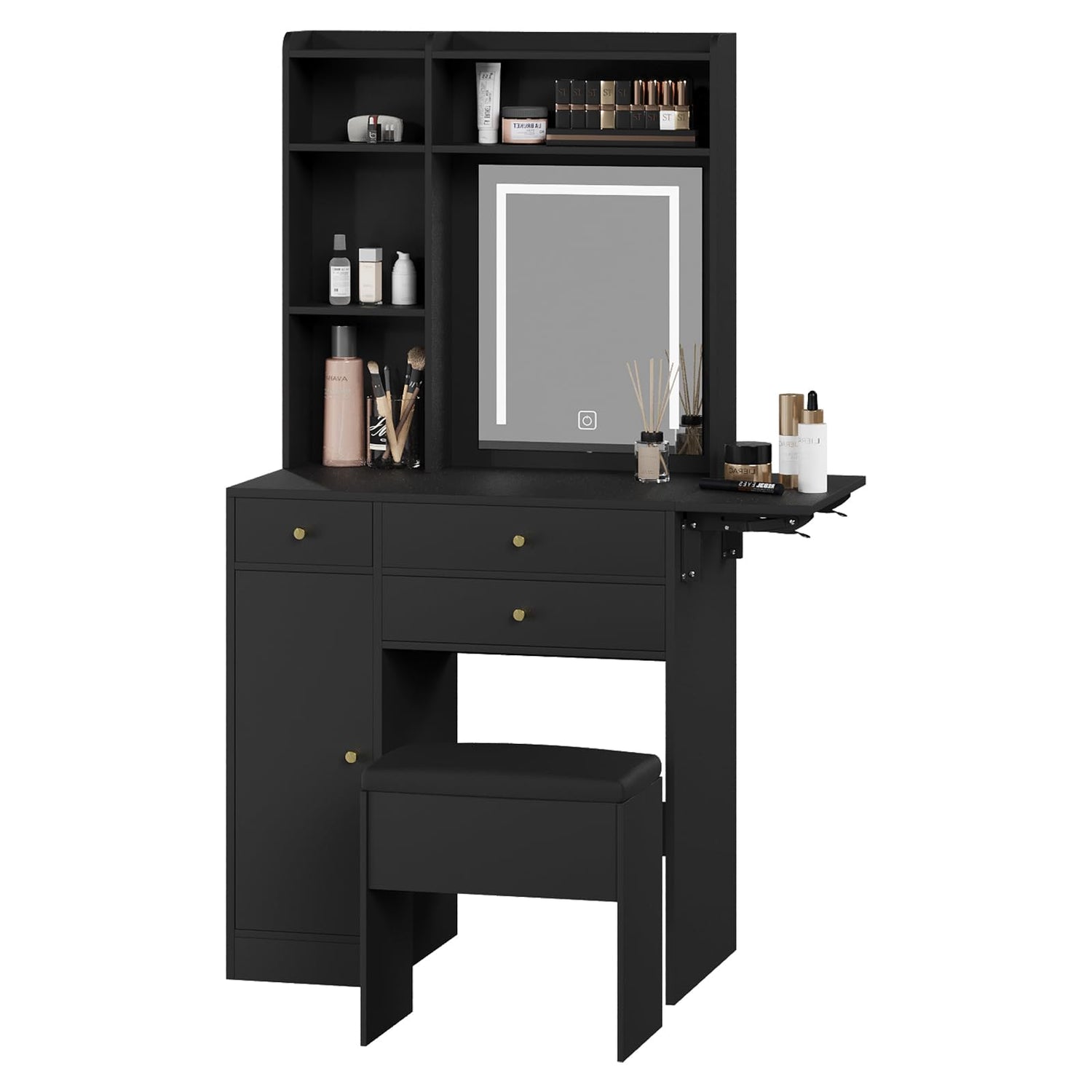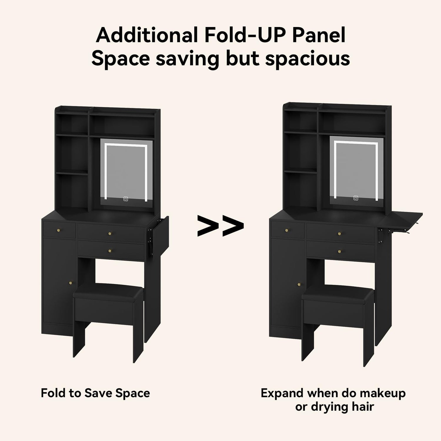 ARTETHYS Vanity Desk with Mirror and Lights Black Vanity Set with Storage Chair Dressing Table with Drawer Makeup Desk with Fold-up Panel for Bedroom