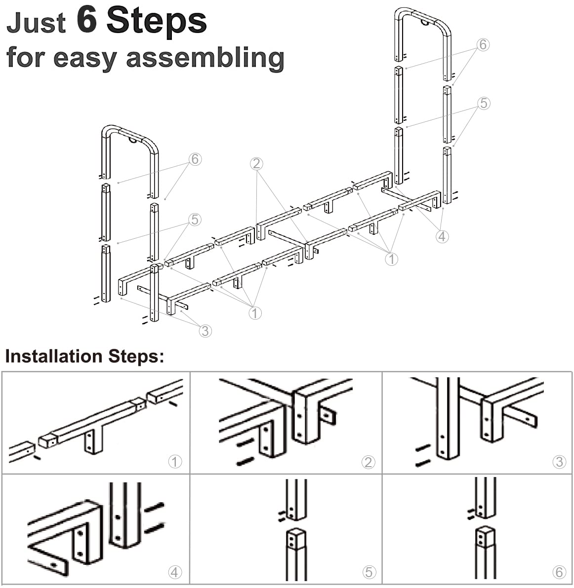 Details: The Artibear Outdoor Firewood Rack is made of all heavy tubular steel construction with a double black powder-coated finish, optimal durability and wood log support, sturdy, rustproof and weather fastness. You can put the log rack frame in any hot, cold, warm or dry climates and hold enough wood for fireplace all seasons. Benefits: 1, Made of tubular steel with powder coated finish. 2, Neatly stacks firewood off of the ground. 3, Heavy duty, Rustproof & Weather fastness. 4, Freestanding for any hard surface storage. 5, 10 extra solid legs for stability supporting. 6, 2 anti tip lock rings for children proofing. 7, High capacity up to 1/2 face cord of firewood. 8, Designed for easy assembly and prolong lifetime. Well Fit on the hard & Flat Surfaces like: outdoor porch, backyard deck, outside fire pits, under eaves, on patios, or put it on a hard surface, such as paving stones, concrete patio or gravel. Operation Tips: ● Use the firewood rack only on hard & flat surfaces; ● Tighten each screw to make sure the firewood standing firmly on the ground. Specification: Assembled Dimensions: 8.0 Wx 1.0 D x 3.8 H feet Total Weight:19.4 lbs Material: Heavy duty tubular steel Painting: Black power coated finish Firewood Capacity: 1/2 face cord