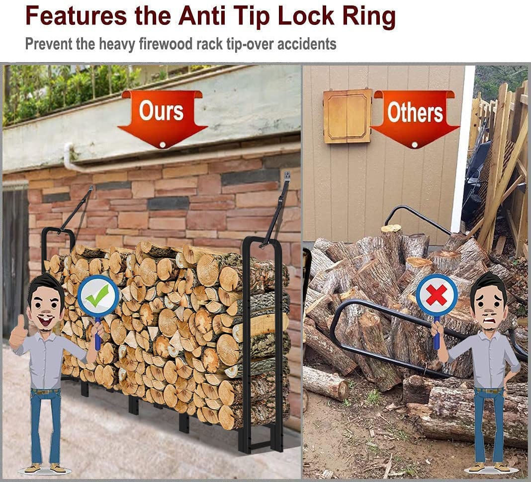 - Features 2 lock rings and 10 solid rack legs, that means we take more care for the safe of your families. Secure the rack reliably and effectively prevent tipping over of the heavy firewoods, which could otherwise result in serious injuries and even fatalities in the case of babies, children. Just lock up the rack with extra straps and put the rack on a hard surface.