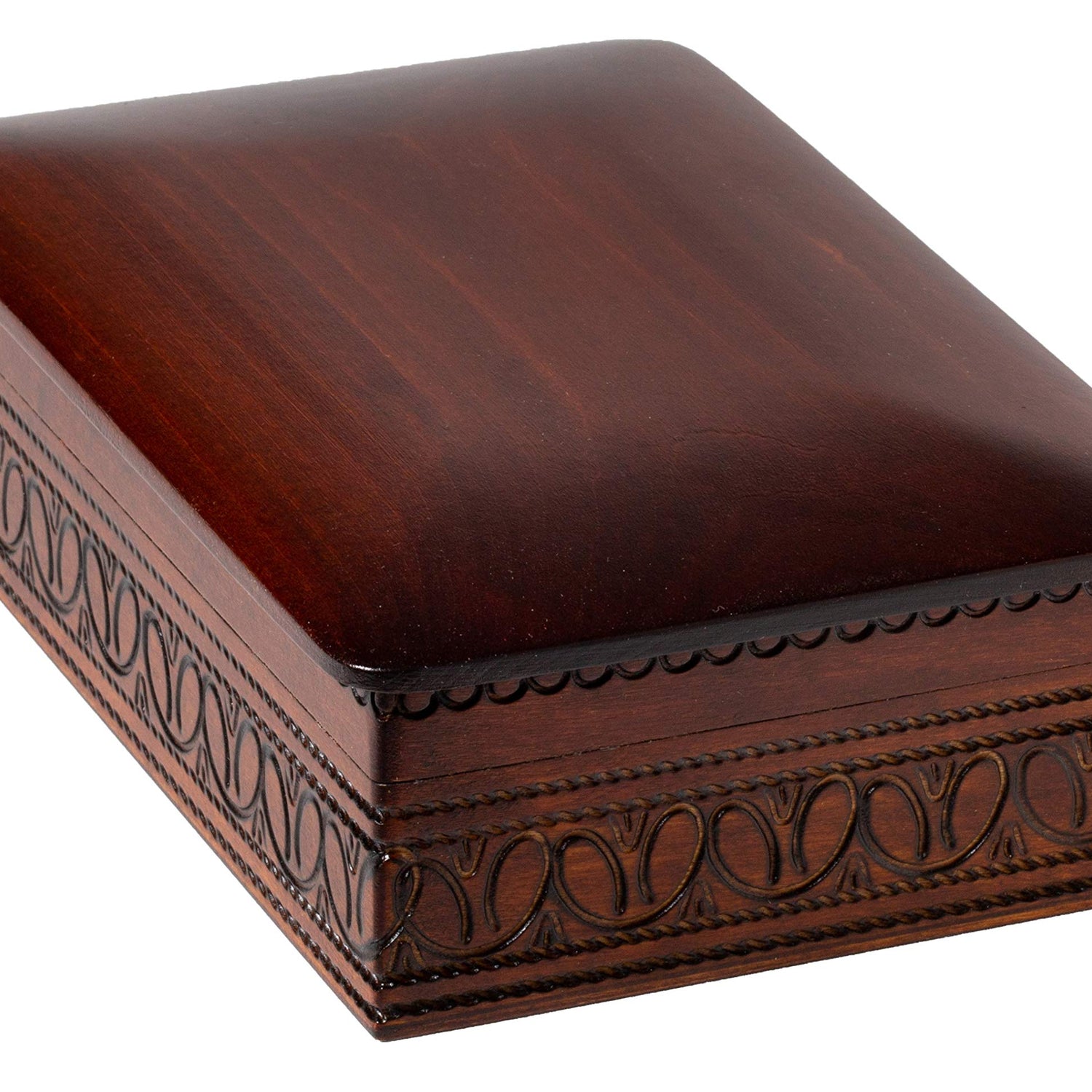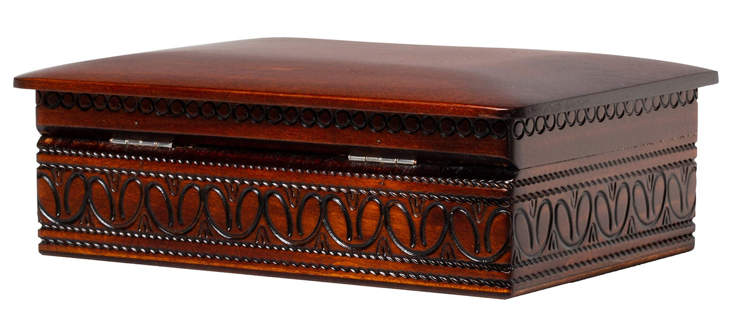 Details: This richly decorated wooden box was made by skilled artisans in the Tatra Mountains of Poland. Historically, lavishly decorated boxes like this were presented as an elegant gift exclusively to royal families throughout Europe to hold their most treasured belongings. Designs traditionally highlighted Polish plants and geometric shapes found throughout centuries of architecture. Many of our Polish boxes now have a modern twist, featuring more contemporary designs such as occupations and Celtic symbols. Using only traditional woodworking techniques, these boxes are hand-carved and secured with brass or copper inlays. Each box is stained, sealed, and lacquered, ensuring its durability. The felt-lined interior will help cushion any heirloom or keepsake kept within.