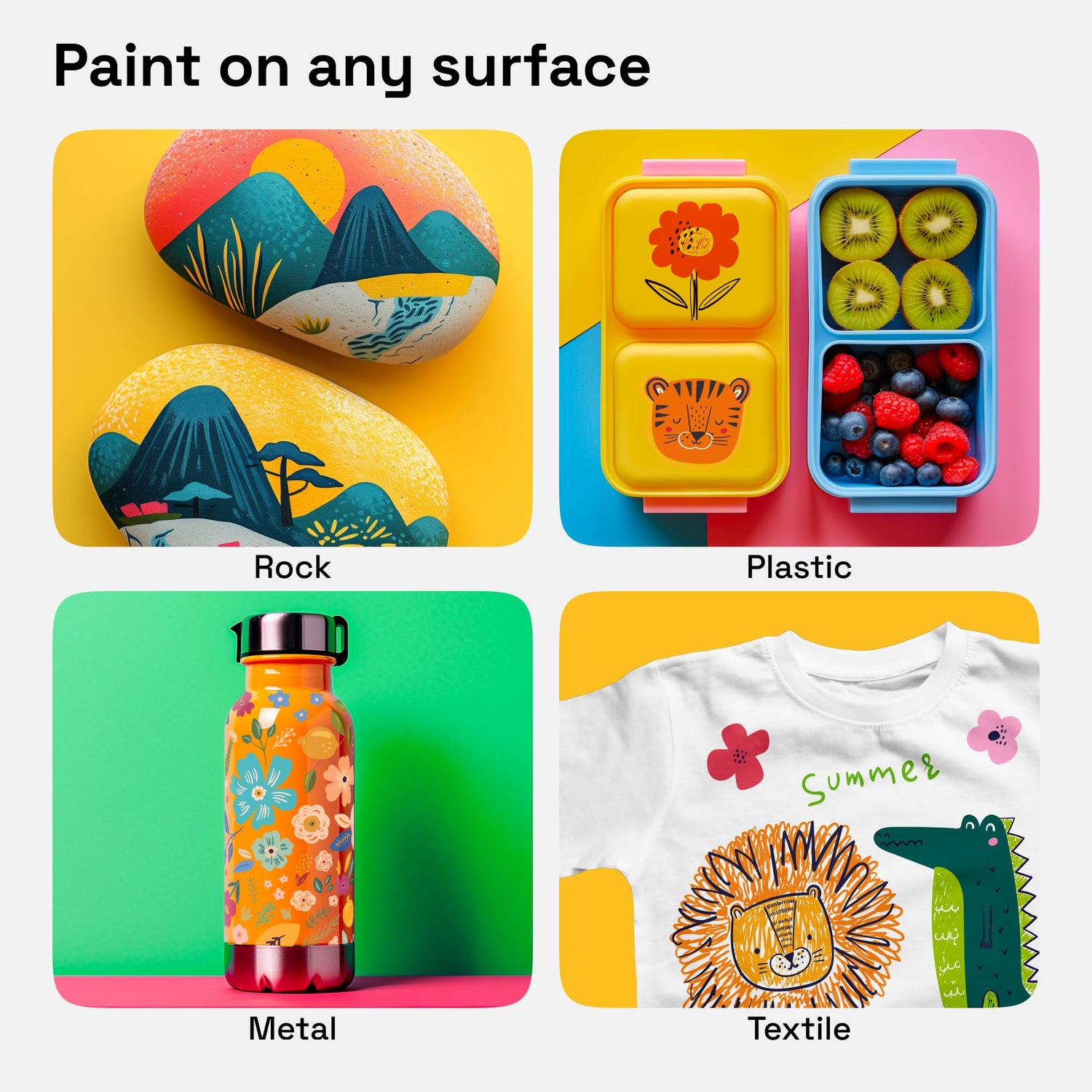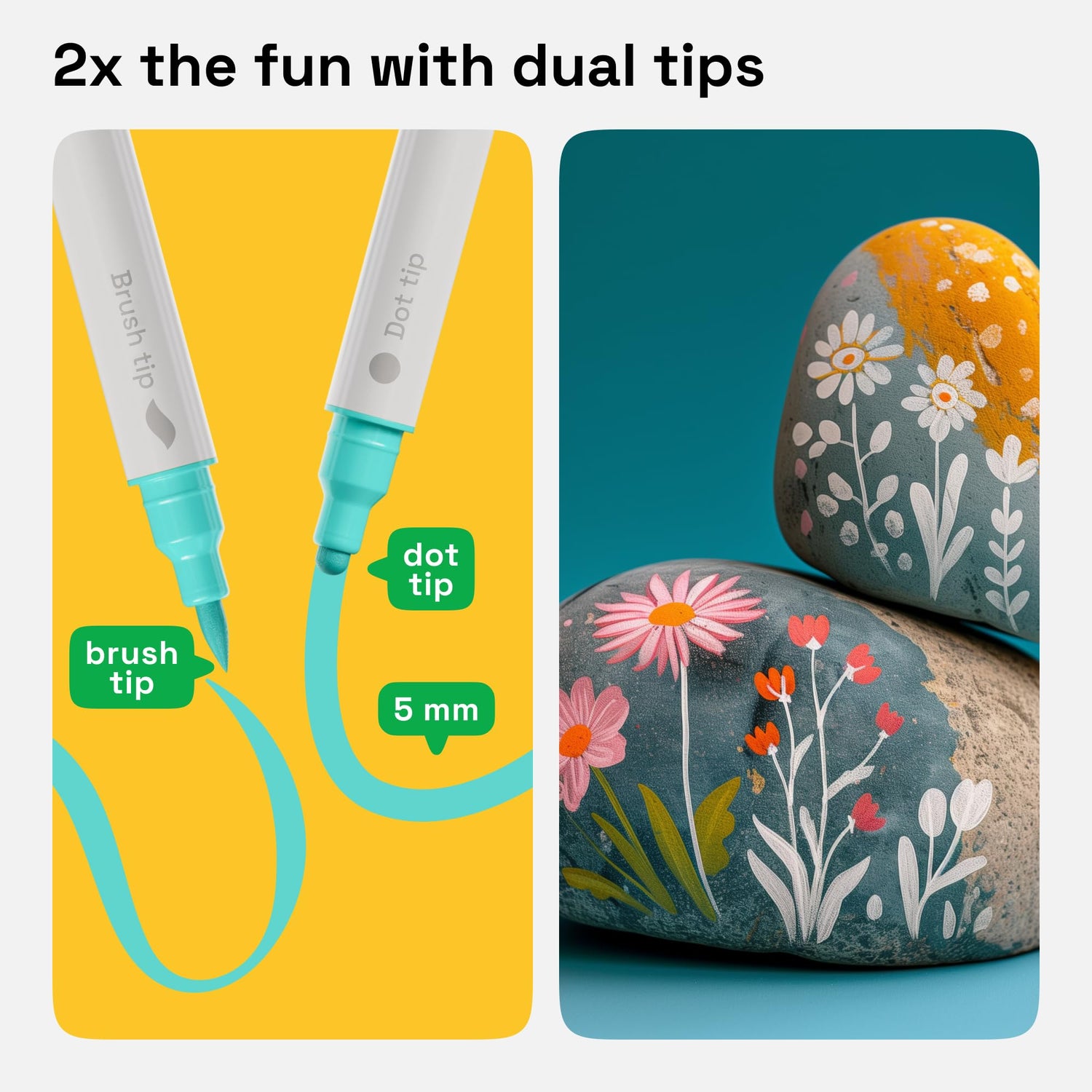 - DUAL TIP: Our acrylic paint markers come with 2 tips for 2x the fun. The acrylic paint pens are equipped with a dot tip and a brush tip. Get the most out of your paint pens acrylic markers with a vibrant palette of colors!