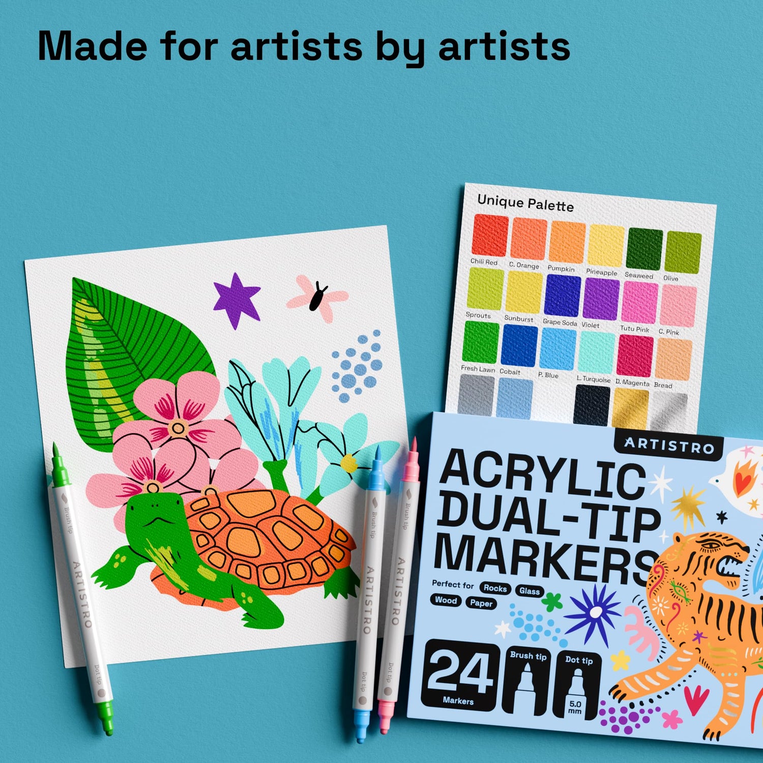 ARTISTRO Acrylic Paint Pens, Acrylic Paint Markers Dual Tip Markers, Acrylic Markers for Fabric, Canvas, Rock, Glass, Wood, Paper, DIY, Paint Markers (Dual Tip Dot + Brush, 24)
