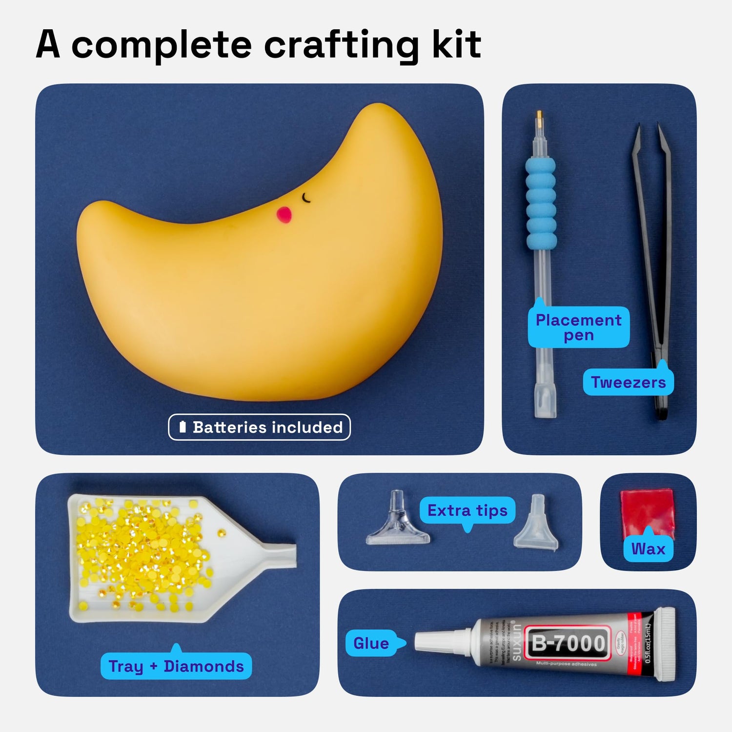 - COMPLETE CRAFTING KIT: Our arts and crafts diamond painting kit includes everything you need to get started from the arts and crafts for kids ages 8-12 night light for kids figurine to colorful gems. The diamond painting accessories also includes a placement pen with tips for 1, 3, or 9 diamonds, glue, clay, and a sorting tray. Our diamond painting kits include batteries so you can immediately illuminate your creation!
